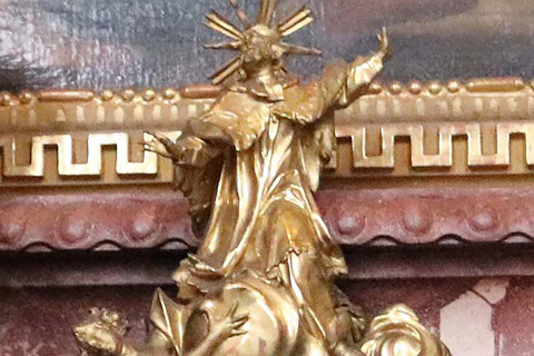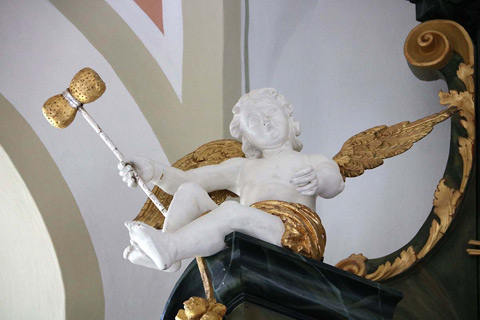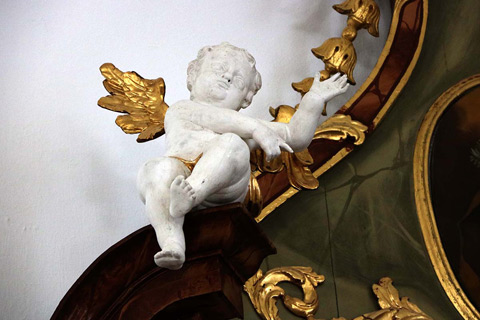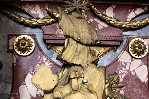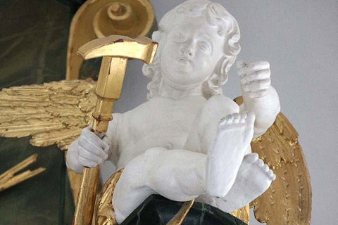 Kipar je obdelal tako sprednjo kot tudi zadnjo stran figure. Danes viden frontalni del je pozlačen, zadnji pa pobarvan rumeno. Obodni profili podstavka so na zadnji strani odbiti. Posebej zanimive so okrogle odprtine v ustih obeh delfinov, ki se nahajata ob straneh podstavka. Strokovnjaki iz BLfD Judith Schekulin, Rupert Karbacher in Andreas Müller, so na podlagi opazovanja omenjenega in primerjave z drugimi kiparskimi deli v cerkvi, domnevali, da bi lahko šlo za bozzetto spomenika sv. Janeza Nepomuka ali vodnjaka, ki bi ga nato priredili novemu okolju v cerkvi leta 1775. Domnevi o možni adaptaciji pritrjuje tudi prazen prostor na desni strani kiparske skupine, ki bi jo verjetno lahko zapolnjeval danes manjkajoči drugi angel. Julia Strobl je za primerjavo pokazala kiparsko skupino, kjer svetnika v nebo dvigata dva angela (Dunaj, Belvedere, inv. 8285).