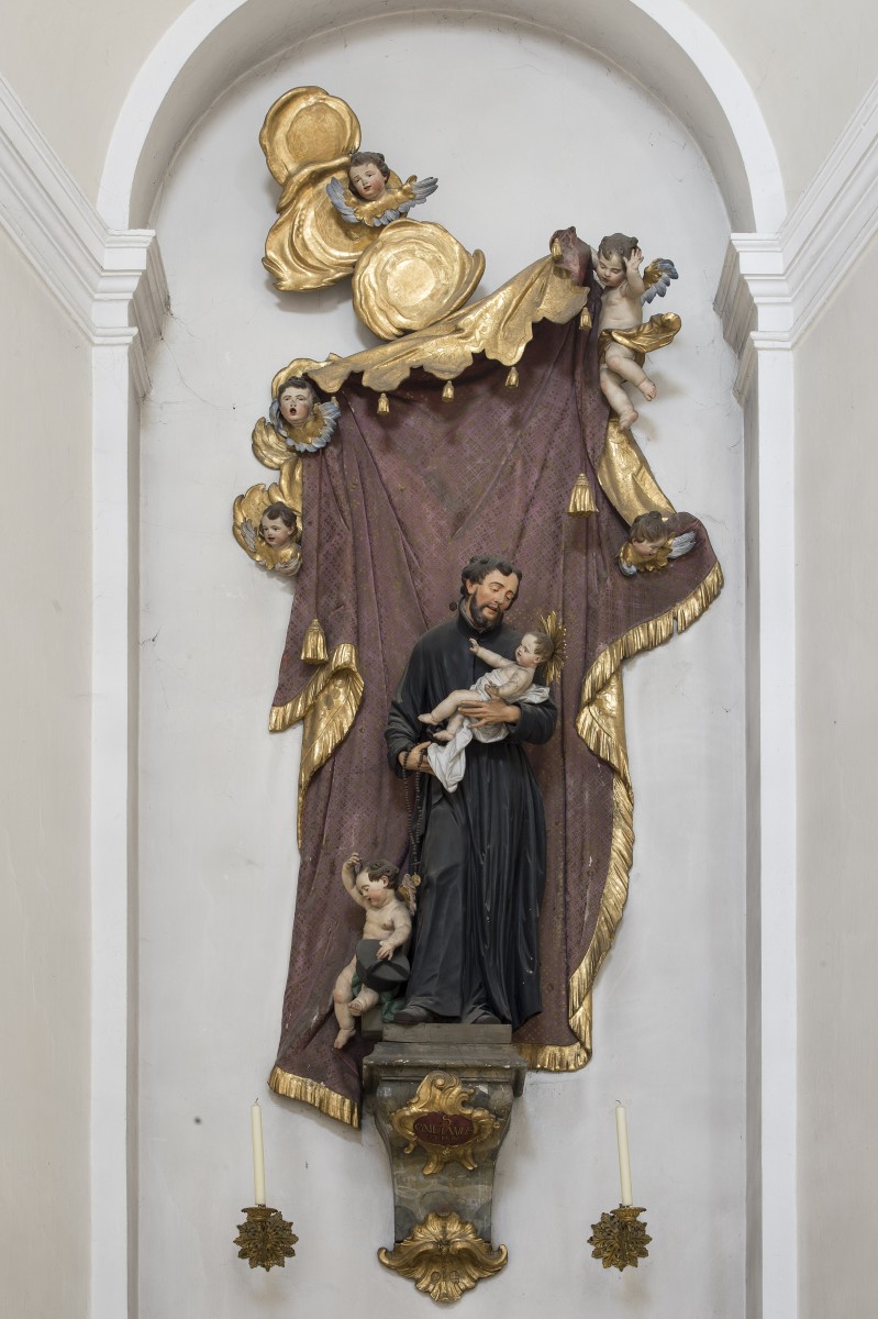 The single sculpture is standing in front of the predella of the altar dedicated St Anna. St Antonius and St Cajetan are standing on 2 consoles left and right from the entry under 2 architectural arches forming a "flat chapel." A curtain held by puttos forms for each sculpture a kind of baldachin under which the 2 saints are standing. Some clouds on top of the formation form the the transition to heaven.