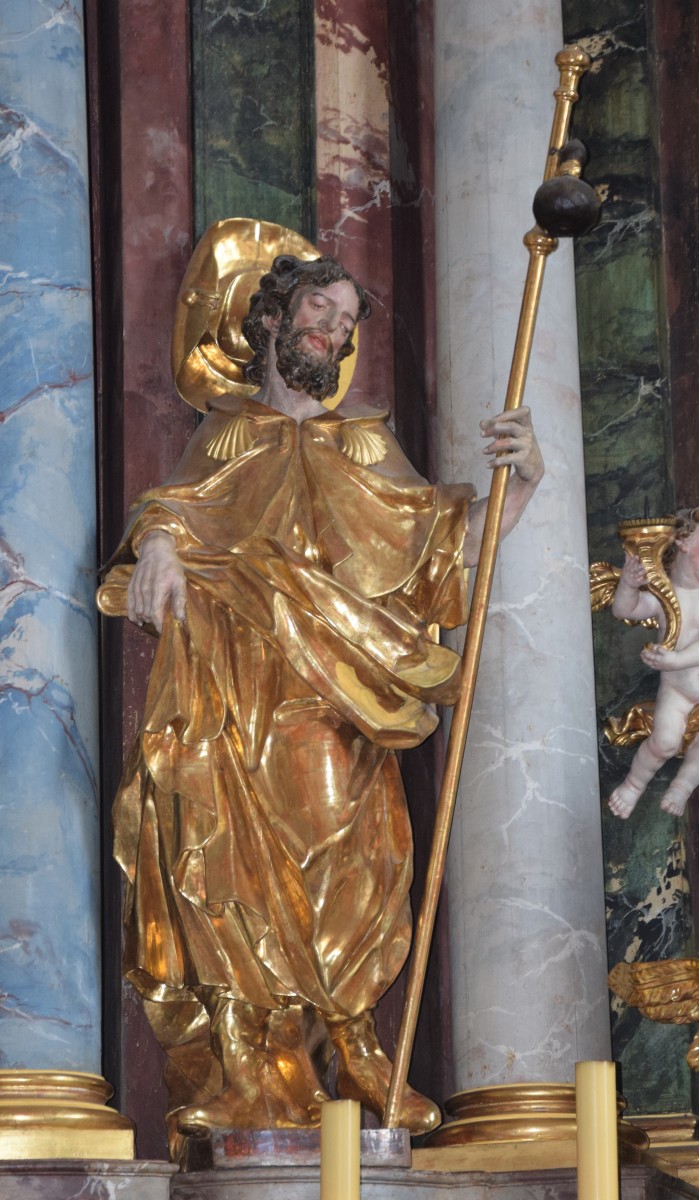 Compared to each other, the statue of St Jacob stands out in particular: the face as well as the drapery is coarser than the others and the idiosyncratic bowl-shaped folds in front of his body are very specific and not common for Straub’s oeuvre.