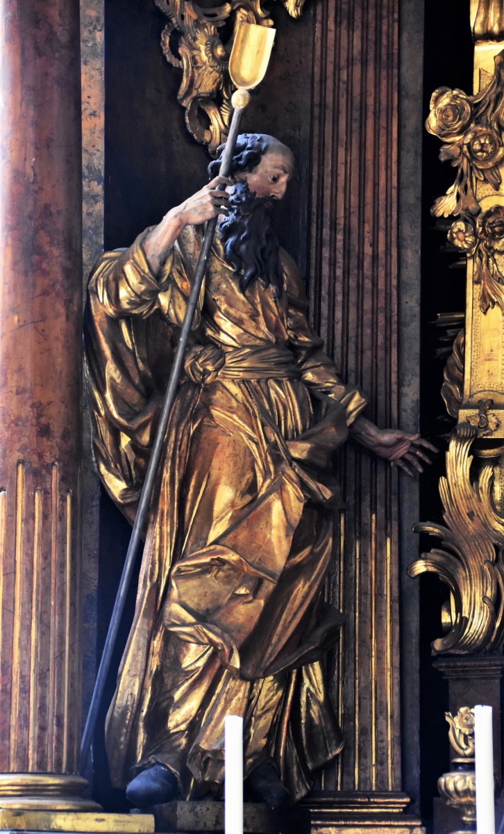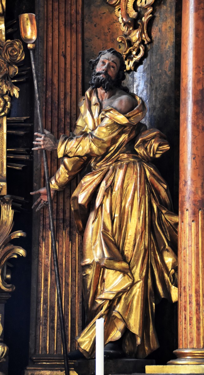 Until the restoration in 1936, the altar of Mary was situated in the south side apse, which it covered.1 It is attributed to Philipp Jakob Straub.2 In a niche in the centre, Mary sits enthroned with her son under a carved canopy. She is flanked by the two standing sculptures of St Joachim and St Josef, both with shepherd’s crook in one hand. They appear very dynamic, which is supported by the bouffant drapery of their clothing. While St Joachim remains stable and introverted, St Josef’s body is remarkably twisted and full of motion. This causes the uncovering of his left shoulder. His eyes are raised towards heaven, his face is characterised by a pathetic feature. The stylistic relationship to the sculptures of the altar of St John of Nepomuk in the parish church of Graz is undeniable.