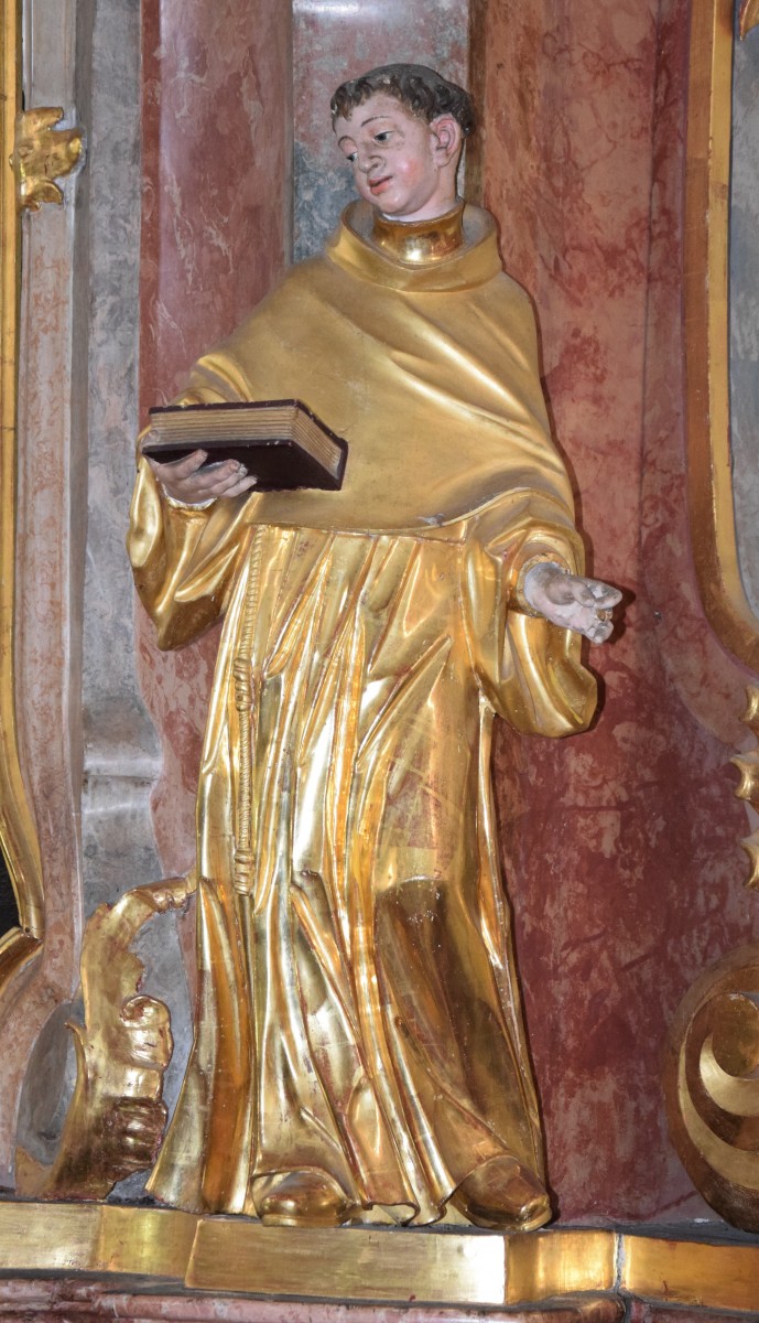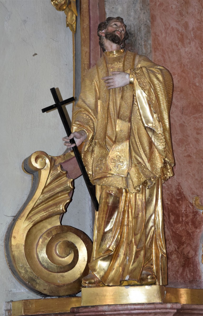 In the place of the former triumphal arch, two side altars were erected in 1744/45.1 The northern one is dedicated to St Stephen and shows the sculptures of St Francis Xavier and St Anthony of Padua. The former is shown in a reduced contrapost with one hand raised to his chest, while the other holds a simple cross. His big, bulging eyes are directed towards heaven. St Anthony is characterised by the mannered posture of his left hand and the more pronounced contrapost. They appear very calm and not that expressive as it is typical for Straub’s middle period (very expressive and vivacious sculptures concerning their gesture, clothing and physiognomy).2 The angels on the entablature are more dynamic and typical for the artist’s oeuvre: wide-spread wings, bouffant cloak that only covers the lower body and expressive postures.