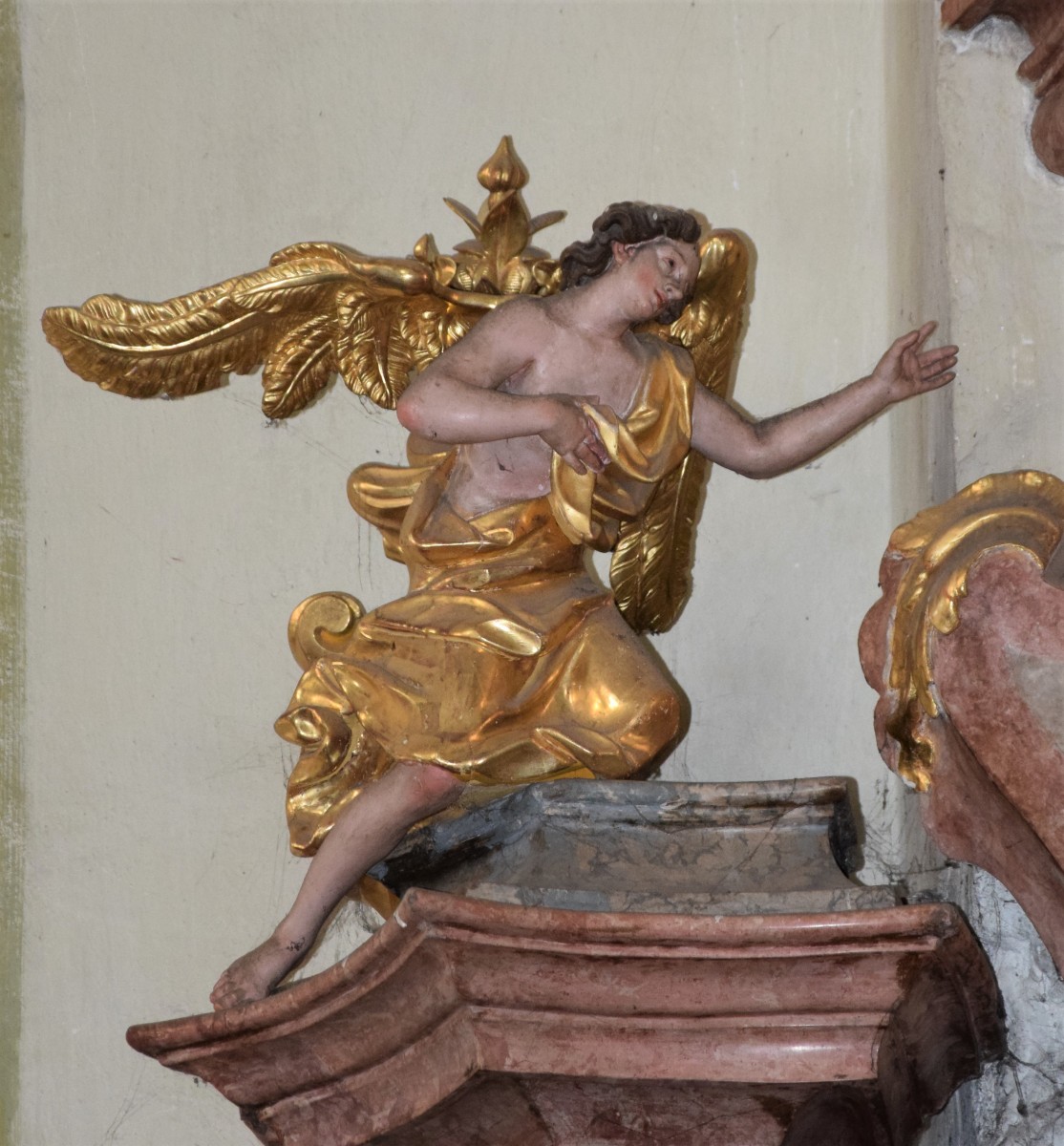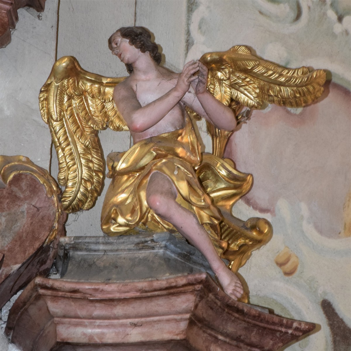 Angel on the entablature (left), pilgrimage church Maria Lebing, Hartberg (photo by Christina Pichler, 2018)
