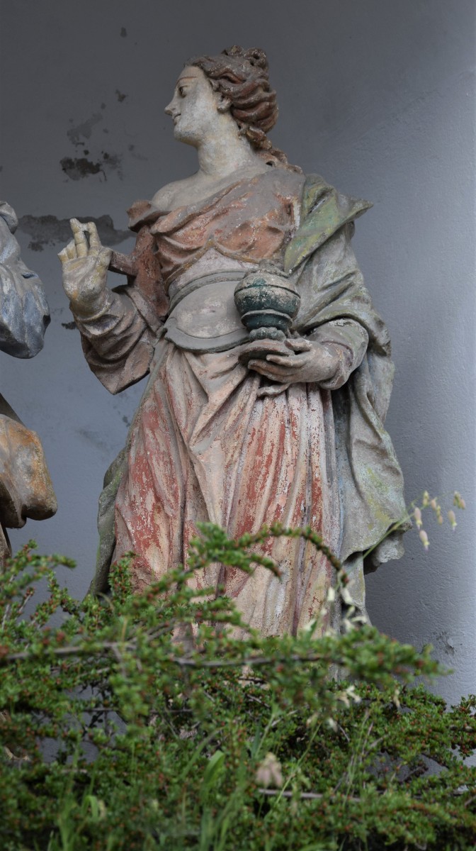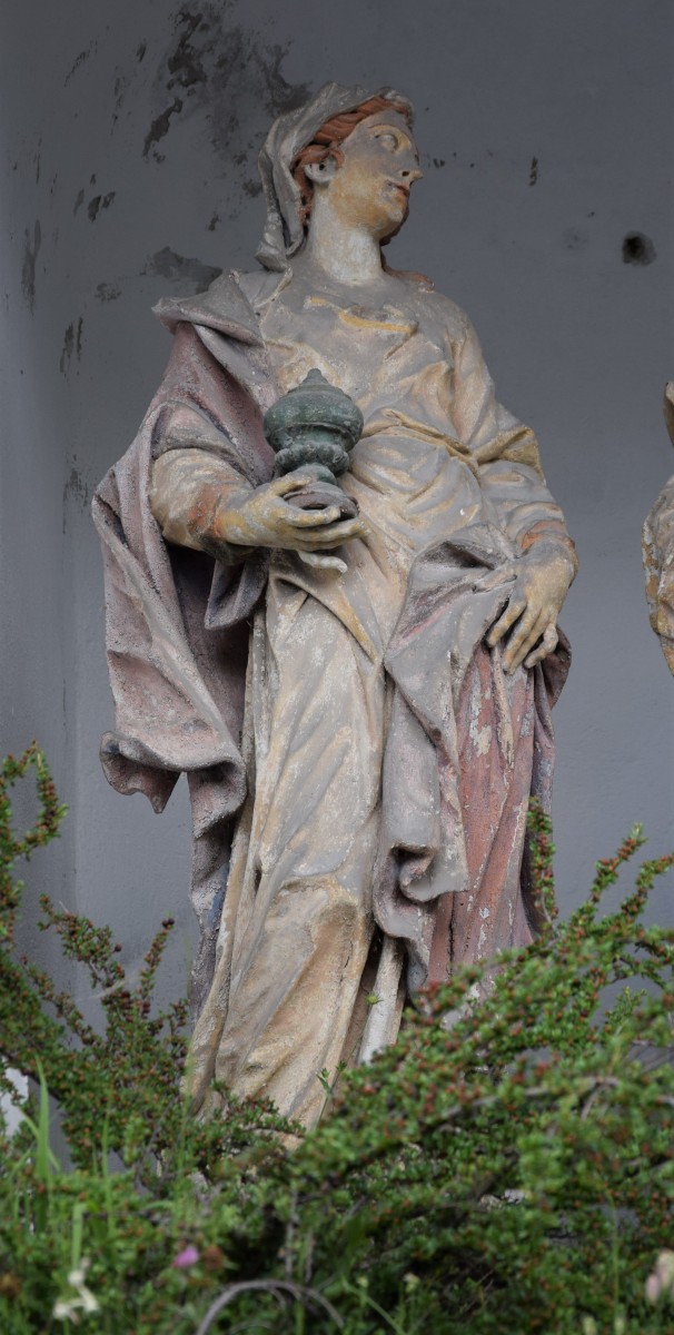 The sculptural group depicting the Three Carriers of the Anointing Oil (Mary Magdalene, Mary, mother of Jacob and Salome) is presented in the last chapel of the round tour, directly next to the Entombment of Christ. They stand facing each other with an ointment vessel in one hand. The artful drapery of their clothing refers to Straub as executing artist as well as the mannered posture of especially the little finger. The remarkable bowl-shaped fold of Mary’s cloak that is formed by a strap, holding it by the hip also indicates Straub’s style.