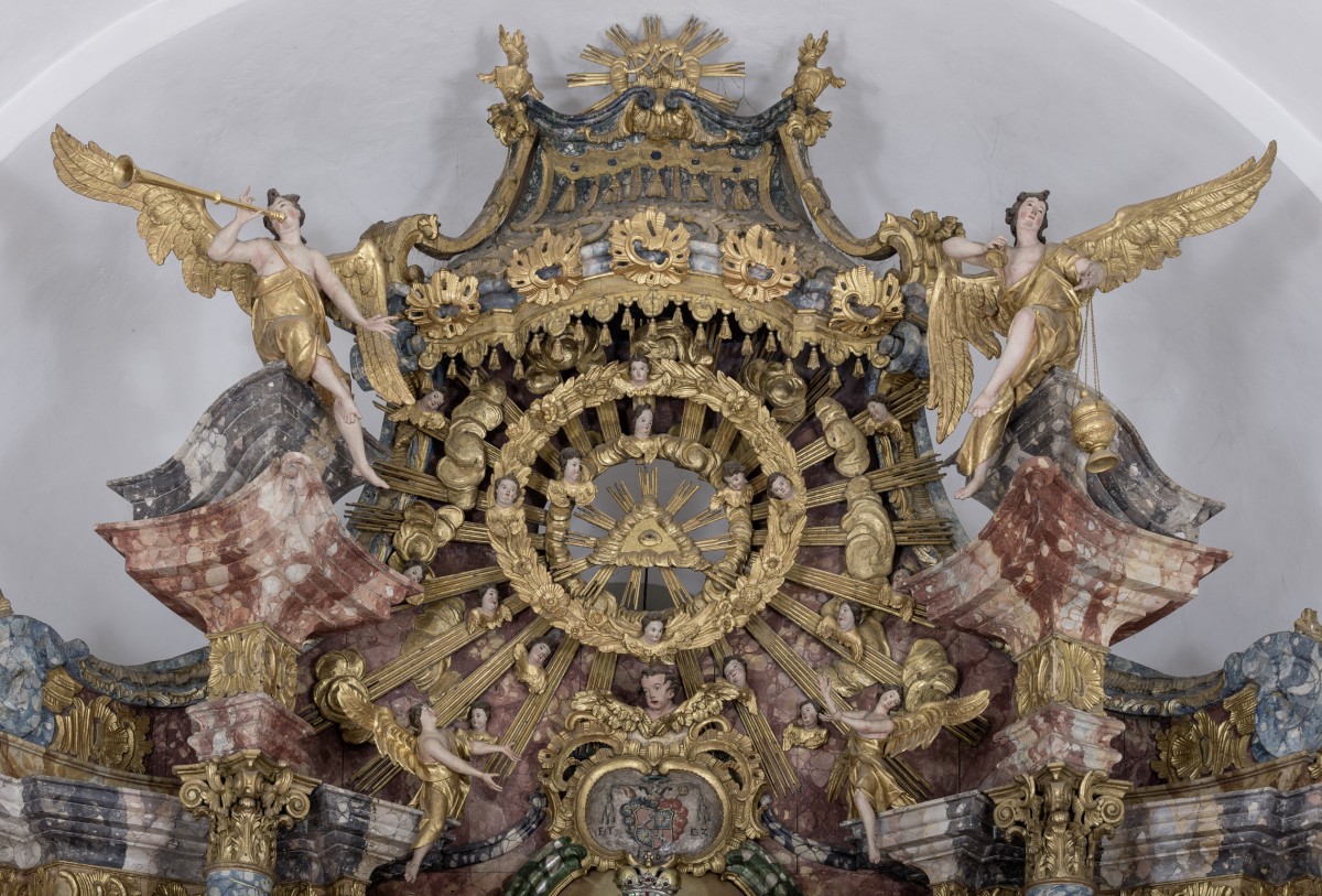 The altar was first mentioned in the canonical visitation of 1761. At the time, the old altar was still standing in the presbytery, but a larger altar, and proportional to the dimensions of the sanctuary, was being created, as a gift of the Bishop of Zagreb, Franciscus Thauszy. 1 In 1765, it was already standing, completed with the polychromy. 2 The coat of arms above the painting reveals the donor Franjo Thauszy, the Bishop of Zagreb (Ins. 1). The painting dates from1644 and originates from an earlier altar. It was a devotional gift from a lady who recovered from a serious illness.3 This original painting had been replaced by a new one made by Johann Beyer in 1851, 4 but later the old painting was returned to the altar.5 The art historian Doris Baričević attributed the sculptures to Franz Anton Straub by on the basis of stylistic resemblance to the works of his brothers. 6 The tabernacle is similar in style to the altar. The upper part of the tabernacle used to be a baldachin with a curtain. The window behind the two concentric circles of the attic that surround the triangle of the Eye of Providence used to be gin lazedyellow. In the past, four angles encircled the Eye of Providence.