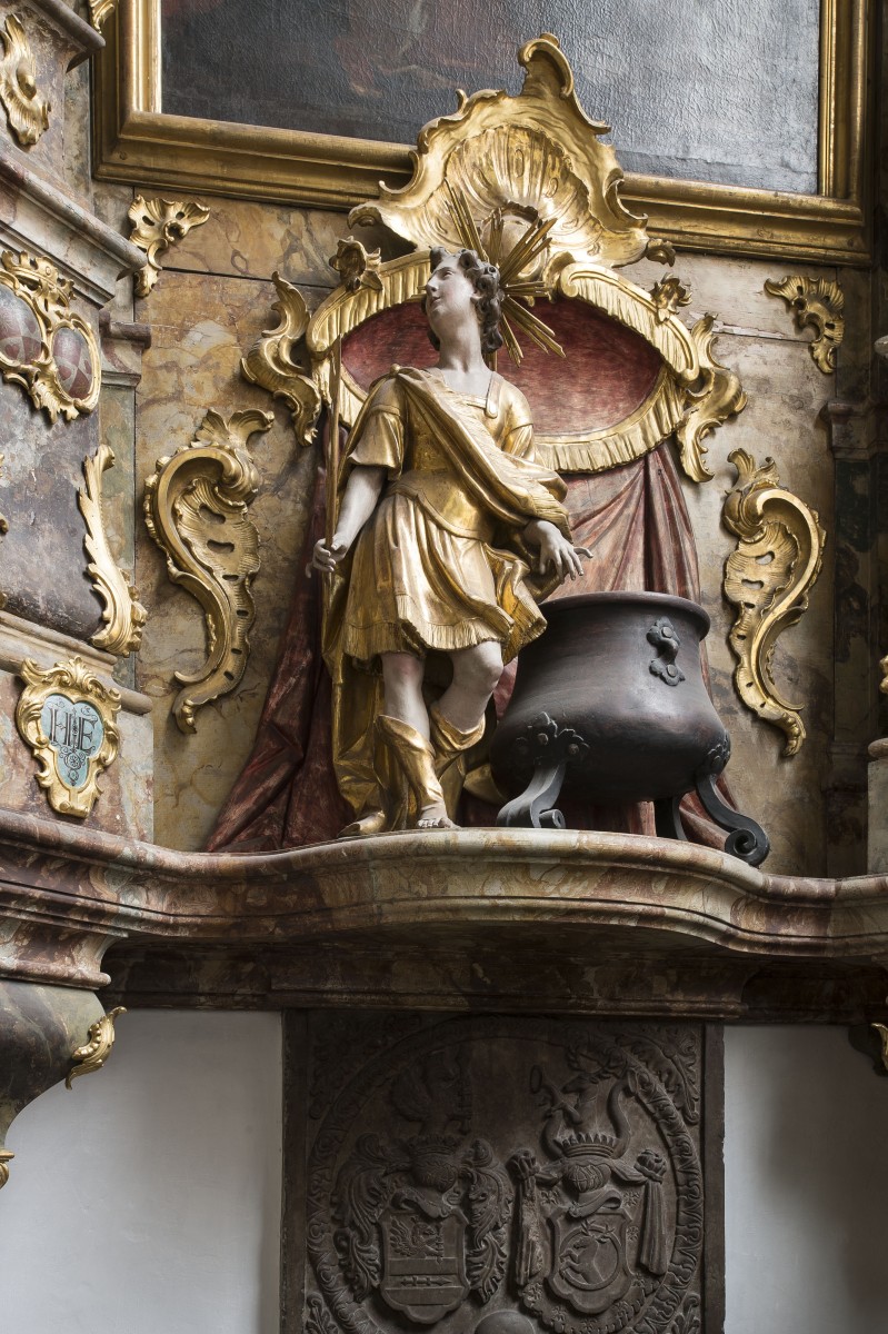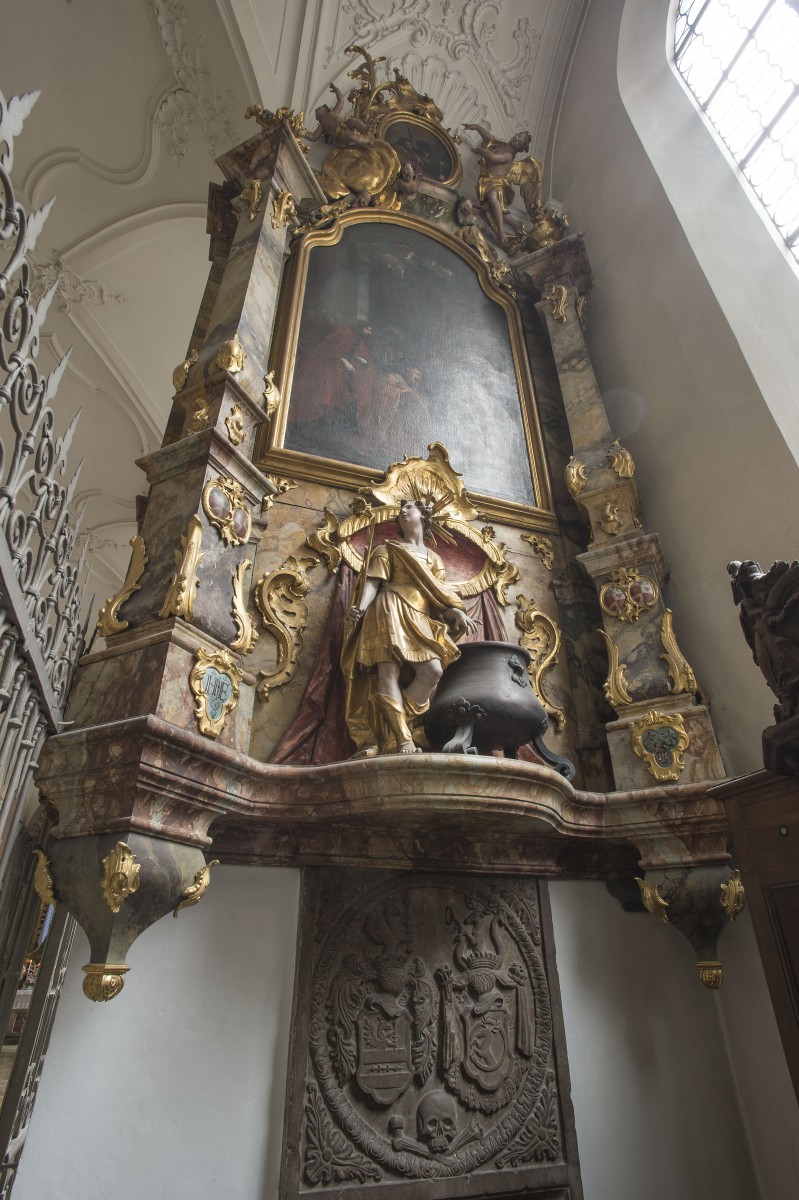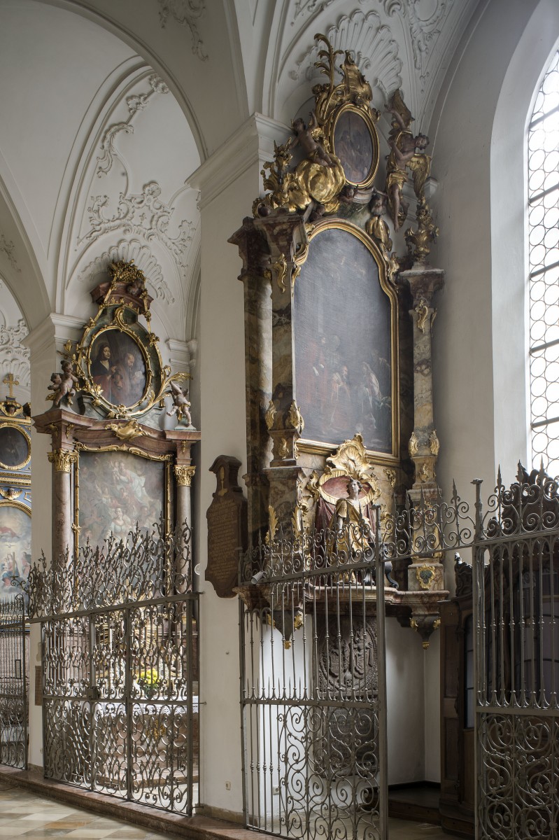In the list of Lippert the 2 sidea ltars dedicated St Epiphany and St Anna have number 21.1 Volk dates the altars in 1750 and 1754.# N-2# The form of the architecture is for the 2 parallel sidealtars the same. The Epiphanyaltar is standing on the southern side of the nave. The pillars on both sides are positioned diagonally over a corner. Two consoles on both sides form the lower final. Two vases decorate the upper zone left and right.The round towelpainting of St Thomas and St Vitus and the main painting which is showing the Adoration of the 3 Kings are not attributed to a painters name. The painting on top of the altar is accompagnied by an angel on its left side and an cherub on its right side. In front of the predella the sculpture of St Vitus with the vessel is presented. Both altars were payed by Anna von Ruffini, The sister of Dean Unertl and the wife of Xaver Ruffini who was a "Hofkammerrat."