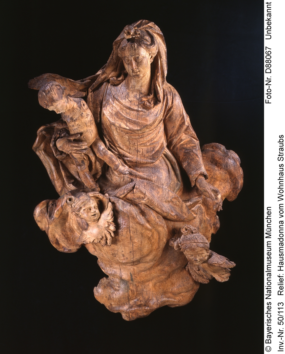 The so-called "House Madonna" (inv. no. is 50/113) is a relief with a bust of Maria holding Jesus as a little child in her right arm. Some clouds are beyond her body two putti are flying in front of the scene. The relief was created by J. B. Straub for the facade of the house he bought in Munich in 1741 in Hackenstreet 10. Volk dates it in 1759. On the backside the year 1759 and ST is carved into the wood.1