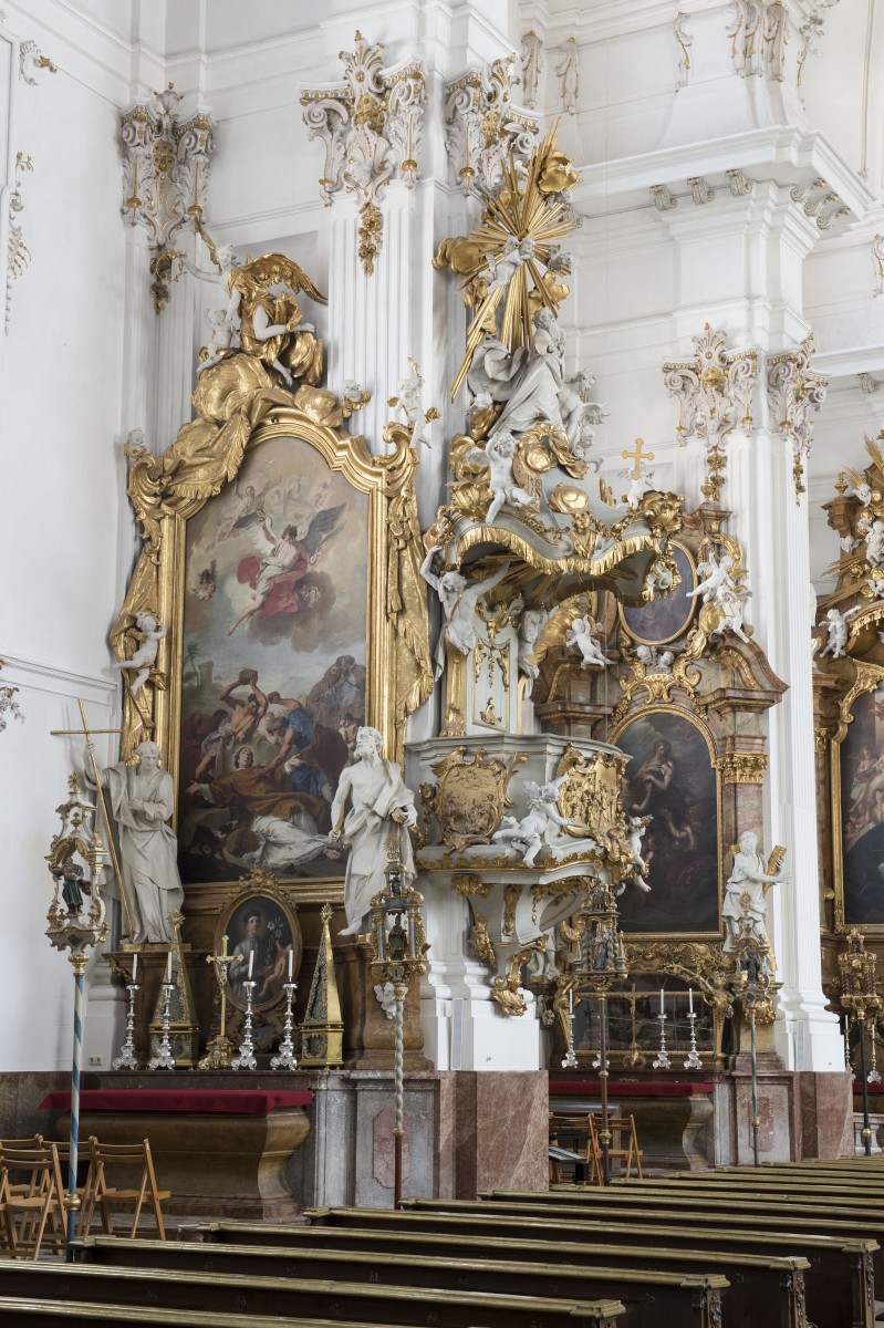 The monastery church of the Assumption of Mary (Augustiner Chorherren) was built by Johann Michael Fischer from 1732 to 1739.1 It is equipped with 11 altars: a huge main altar, 8 side altars and 2 altars in the entrance hall executed by different artists (Ehrgott Bendl, Joachim Dietrich, Egid Verhelst, Franz X. Schmädl). The tables of the sidealtars are all made in the same form and material (stone/marble). Only the upper structure has an more or less individual character. Always two parallel altars are created by the same artist. In Dießen we don´t have sketches of of the altar or pulpit (existed but is lost) of J. B. Straub. The construction was built by a joiner, the sculptures were carved by J. B. Straub or by his staff. In the list of the most important works by J. B. Straub that J. C. Lippert edited in 1772 Dießen has the number 53. 2 The prize for 2 sidealtars each for 1277 fl and 1 pulpit for 9000 fl is documented. 3. Straub also was responsible for the realisation of 2 tabernacles on the 2 sidealtars of Ehrgott Bernhard Bendl (1660-31.01.1738), the balustrade of the organ choir and the decoration for the organ. Straub worked for this church at least from 1738–1740.