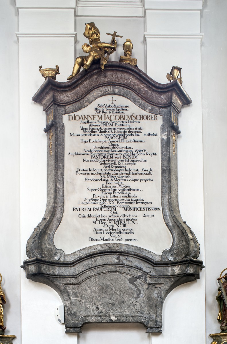 The inscription is: Siste Viator, & admirare Isthoc in Templo sepultum Adm. Rev. & Eximium D. JOANNEM IACOBUM SCHORER Augustanum Suevum Sacerdotem Jubilaeum Alterum ONIAM Pontificem Virum bonum, & benignum, verecundum à visu, Modesteum Moribus & Eloquio decorum Manus protendentem, & orare pro omni Populo suo, 2 Machab. PAROCHUM Huius Ecclesiae per Annos LIII. Zelosisimum;Quam Ut exhiberet sibi Gloriolam, Non habentem maculam, aut rugam, Ephes. V. Amplisimarum Facultatum suarum ex alse Haeredem scripsit. PASTOREM, verè BONUM Non modoò dum viveret oves sibi concreditas Verbo pavit, & Exemplo: sed & moriens Ut vivam haberent, & abundantius haberent, Joan.10. Pro eorum incolumnitate cum spirituali, tum temporali SS. Misae Sacrificia, Hebdomodaria, & Menstrua, éaque perpetua Fieri voluit Etiam post Mortem Super Gregem suum vigilantisimum E genis Parochianis, Parvulis in litteris erudiendis , AEgrisque Ope pharmaceutica juvandis Largas annuatim CXX. florenorum Eleemosynas Testamento legavit PATREM PAUPERUM MUNIFICENTISSIMUM Qui cum dilexisset suos. in finem dilexit eos: Joan. 13. Eorum Amori planè immortuus VI DEC Ao MDCCLX Aetatis XCIII. Annis, an Meritis gravior, Tuum lector lucidium esto. Vale, & Piissimis Manibus benè precare.