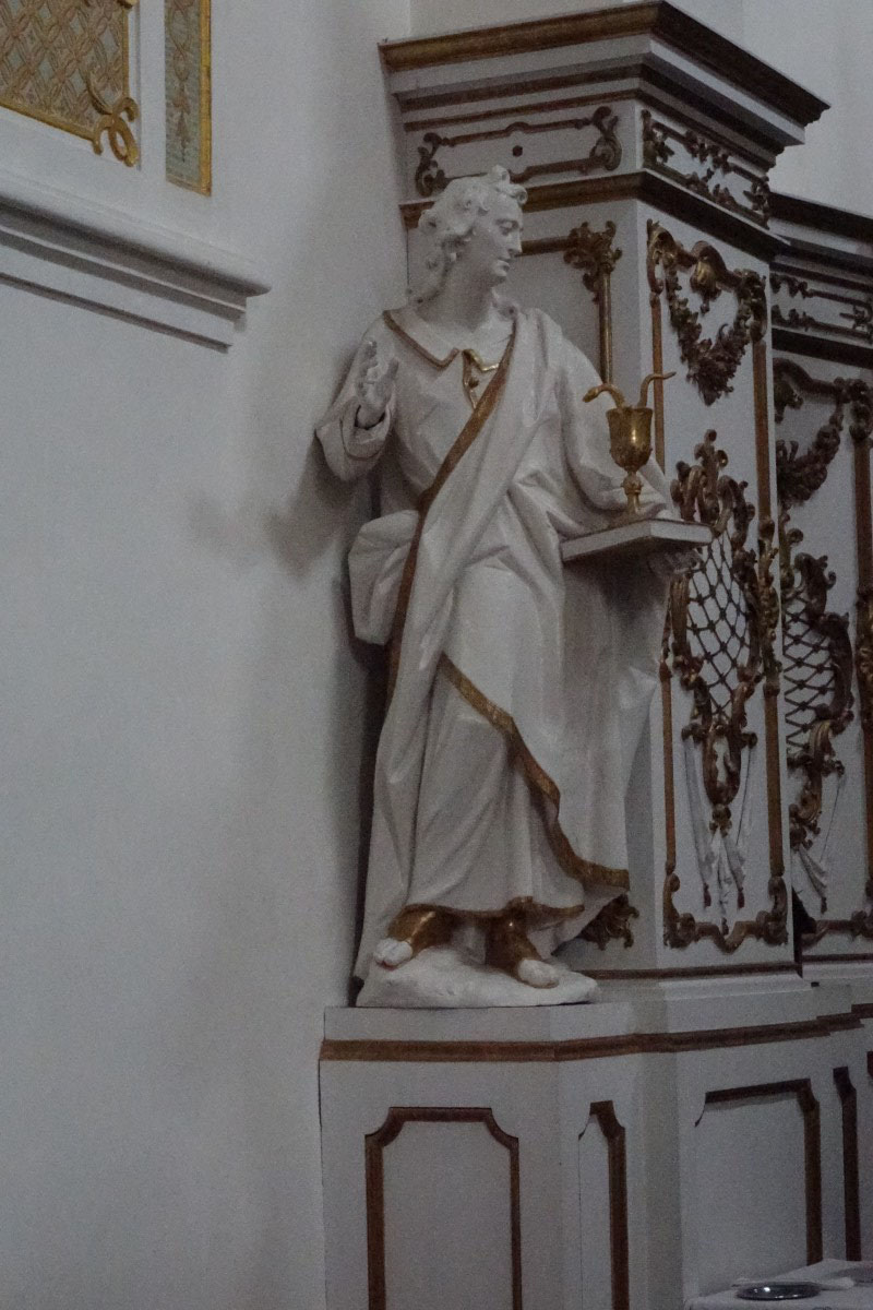 - The sculpture of St John in the choir of the Parish (former Monastery) Church of St Alto and St Bridget, Altomünster (Bavarian State Department of Monuments and Sites, photo by Rupert Karbacher, 2019)
