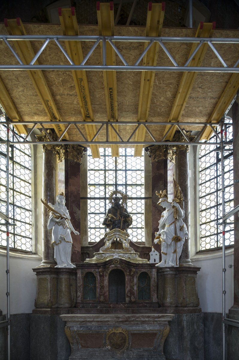The chapel of St Benedict is not yet restored because there are static problems with the underground of the chapel. The 4 sculptures wooden sculptures with a monochrome white painting layer combined with a water gildung were removed from the altars in 1879. In 1902 they were rediscovered restored and placed on consoles apart from the altars. In 1946 they were overpainted and came back to the altars but not in the original positions. In that period the position of the head of St Benedicts bust was changed from the inclined position into a straight looking one. The higher position was reduced by removing the lower part of the pedestal (documented by a foto). Because of that the head was interpreted by arthistorians to be a younger addition. In context with the complete restoration of the church (1998–2004) the sculptures were examined in the workskop of Bavarian State Department of Monuments and Sites in 1998 and restored in 2004. In 2008 after the last restoration of the 4 white sculptures by a freelance restorer they came back into their original position proved by archival documents. After finding out that the original positon of the head was inclined to the left this position was reconstructed. The painting layer was conserved. It dates into the middle of the 18th centurry. The oil silver on the head executed in 1946 was not removed. From archival documents we know that there was a second bust made in 1765 by a silver-smith called Joseph Reichenzein. The silver-bust was only presented on the occasion of high church festivals. The 2 sculptures in the niches of the predella have a rare original polished black painting layer combined with water gilding and impact metal. There is another !8th century bust representing the Sacred Heart of Jesus which similarities with the style of J.B. Straub.