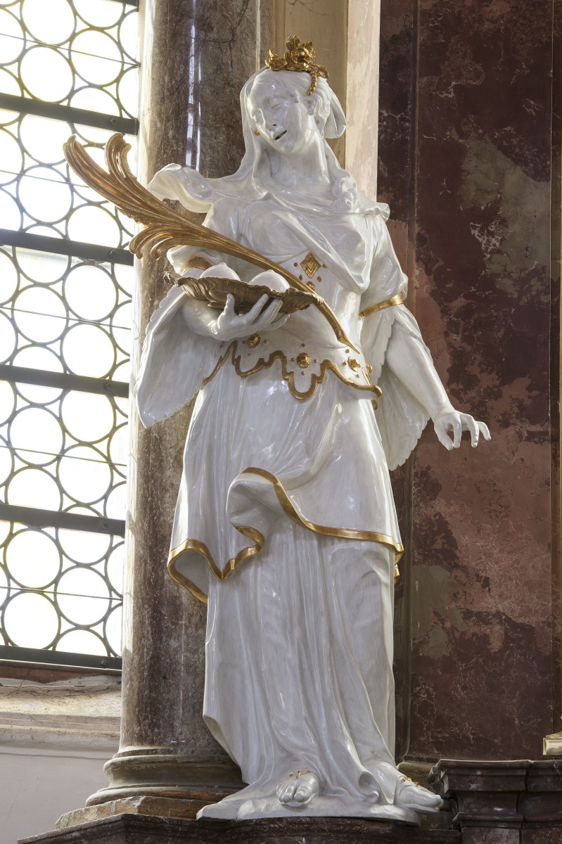 In the list of J. C. Lippert the 5 sculptures are registered under number 50 and 51.1 S. Agatha, St Florian, St Rochus, St Sebastian and a bust of St Benedict are part of the 2 sidealtars dedicated St Benedict and St Quirinus. The center of the altar dedicated St Benedict is the bust of St Benedict. Two small sculptures representing St Placidus and St Maurus are presented in two niches of the predella behind glass of the altar dedicated St Benedikt. They are not attributed to an sculpturor. The sculptures representing St Agathe and St Florian belong also to this altar. Both altars were erected in 1748 by marble combined with stucco. The architecture is partially decorated with metal ornaments in silver and gold. The tabernacles are made by gilded copper. The stucco of the altar and the reliefs at the walls and the ceiling were made by M. J. G. Üblher (1703–1763).2 Concerning the date of origin of the sculptures N. Lieb supposes a connection with the 1000 years anniversary of the monastery in 07. 7. 1753.3 R. Götz says that the anniversary was held in 1746.4