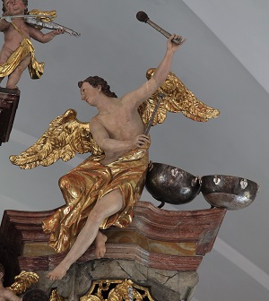 According to documentary entrance, the sculptures of the organ were made in 1765 by Philipp Jakob Straub.1 They appear very vivacious and dynamic and represent the heavenly music. They are arranged according to the triangular composition: In the lower area, there are two standing angels with a harp and a lute flanking the organ. Above, there are two putti with a hymnbook and cymbals and two sitting angels with a trumpet and timpani. Next higher we see a putto with a two-part elongated instrument and one with a violin, followed by the last two musicians, a putto with a clarinet and one with a flute. On top, there a two putti apparently falling downwards. It is evident, that the sculptures on the organ show significant differences in their quality.