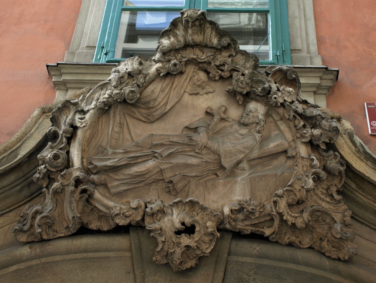 The half-relief of St Francis Xavier and the sculptures of two putti on the portal of Sporgasse 13, Graz