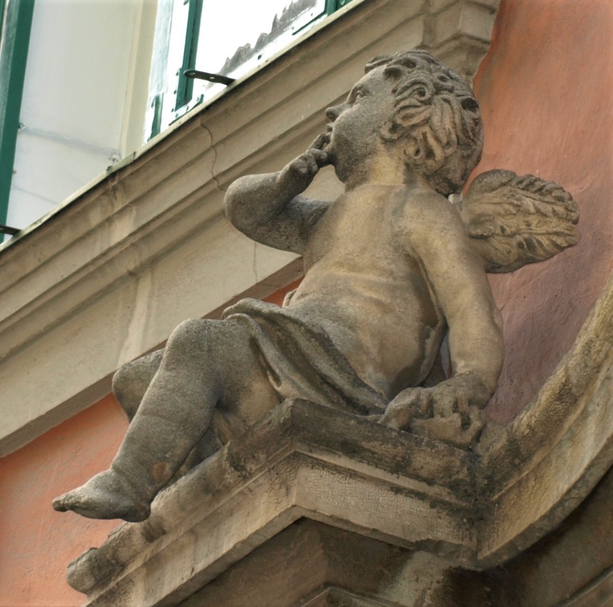 The sculpture of a putto (left), detail, portal, Sporgasse 13, Graz (photo by Anja Lindbichler, 2018)