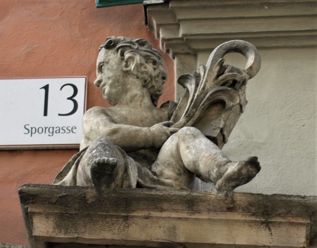 The sculpture of a putto (right), detail, portal, Sporgasse 13, Graz (photo by Anja Lindbichler, 2018)