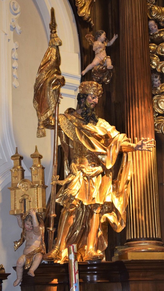 On the left, next to the high altar, is Margrave Leopold of Austria standing confidently, with a lance in his right hand. The other hand is raised and shows strongly spread fingers. At his feet is a putto holding a model of the church above its head. According to Rochus Kohlbach, Leopold is very striking in appearance: vigorous head, “Basedow-eyes” with bulging eyeballs and heavy lids, distinctive nose, broad and fleshy lips, massive curls (corrugated and sicking radially out from temples and cheeks).4 He is comparable to the sculpture of St John the Baptist in Maria Lebing (1749).