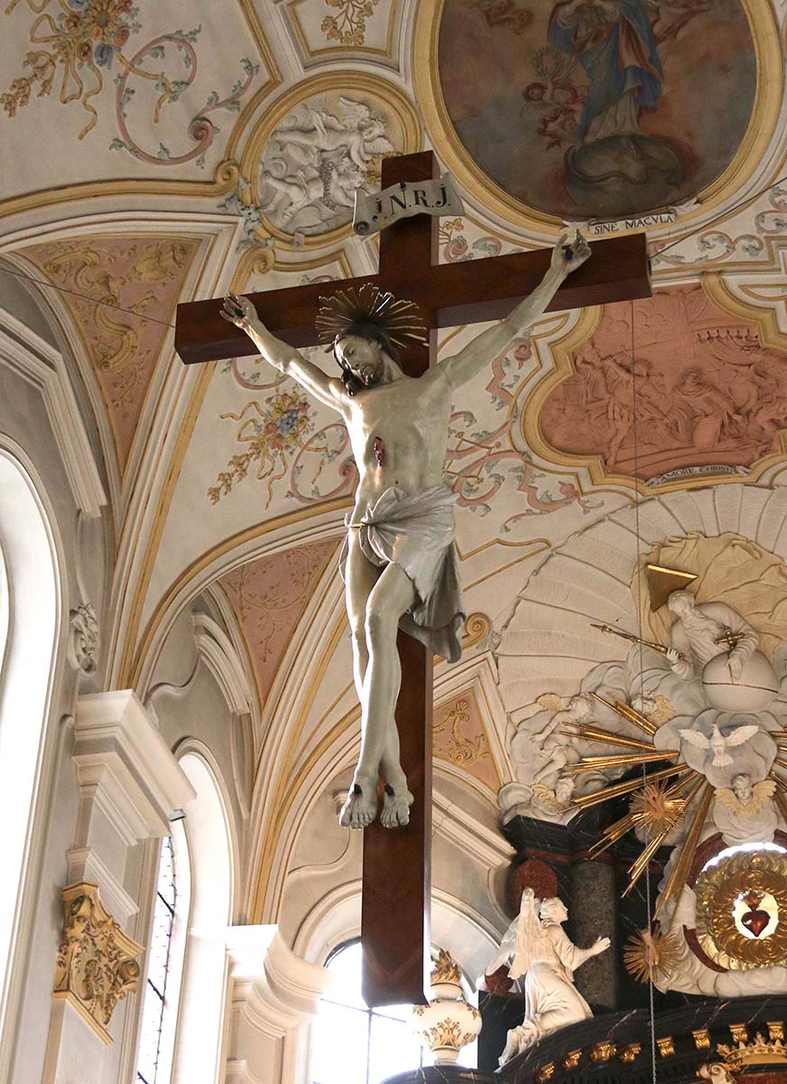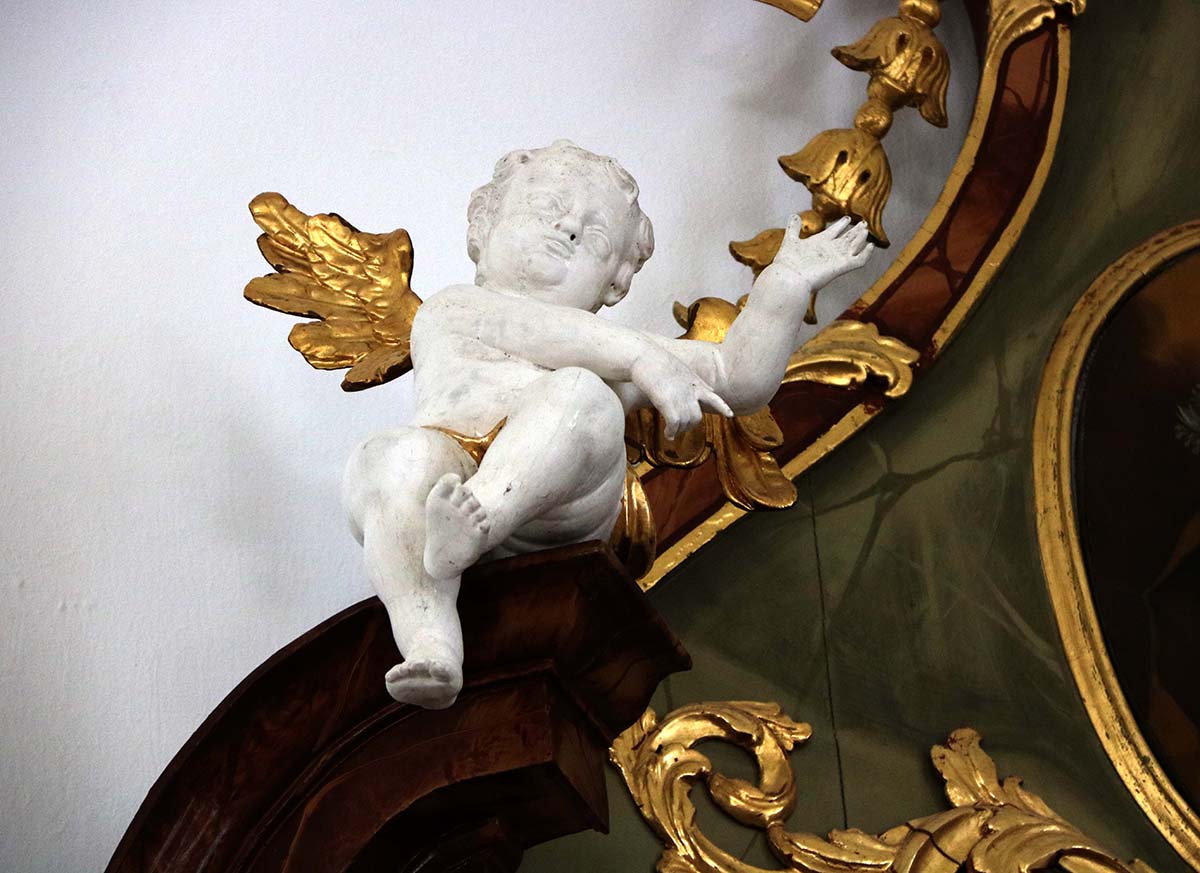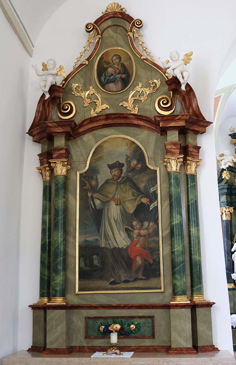 Za suprotni oltar, J. Streiter je 1775. godine izradio jednaku skulpturu svetog Alojzija Gonzaga. Dva anđela lijevo i desno od oblaka nose svetog Alojzija koji pobožno kleči na vrhu oblaka. Skulptura sveca zaštitnika, sv. Cirijaka, trenutno se nalazi na svom prijašnjem mjestu. Nije poznat razlog zašto je skulptura J. Streitera uklonjena. Na predeli prvog bočnog oltara na lijevoj strani broda je skulptura visoke kvalitete Zamišljenog Krista (Christus in der Rast). Neobično je da Volk to ne spominje u svojoj knjizi.
