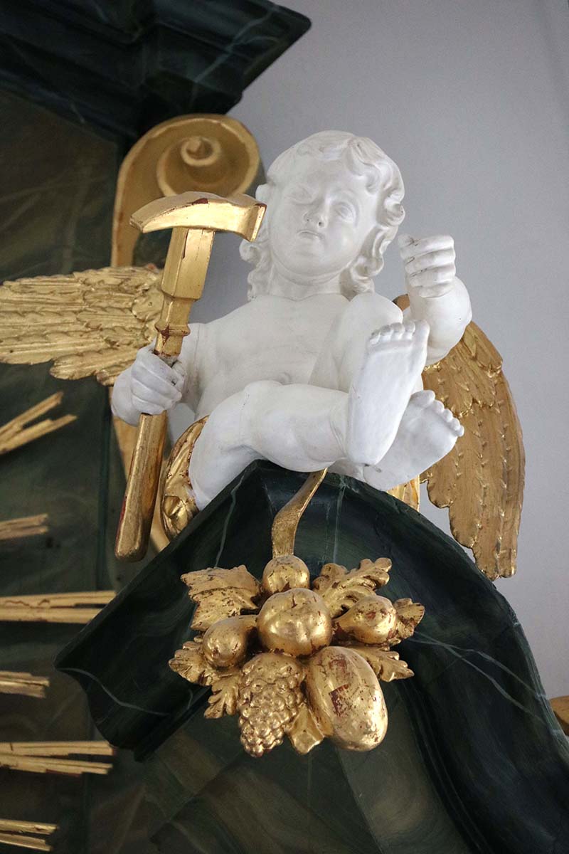 Kipar je eksplicitno razradio prednju i stražnju stranu skulpture. Sada vidljiva prednja strana je pozlaćena, a stražnja strana je obojena žutom bojom. Obodni profili postolja na stražnjoj strani su odstranjeni. Još jedan istaknuti detalj su okrugle razrade u ustima dva dupina koji se nalaze na uglovima postolja. U kontekstu s instalacijom skulpture u unutrašnjosti crkve, to se ne čini razumnim. Navedena opažanja stručnjaka iz Bavarskog državnog ureda za zaštitu spomenika, Judith Schekulin, Rupert Karbacher i Andreas Müller, dovela su do pretpostavke da je skulptura izvorno bila skica (studija) za spomenik ili fontanu sv. Ivana Nepomuka koji je prilagođen novom položaju 1775. godine. Praznina na desnoj strani grupe skulptura ispod sv. Ivana Nepomuka dokaz je promjene; vjerojatno upućuje na bivši položaj drugog anđela koji nedostaje. Gđa. Strobl je pokazala sliku usporedive skupine (Muzej Belvedere, Beč, inv. br. 8285) gdje dva anđela podižu sveca.