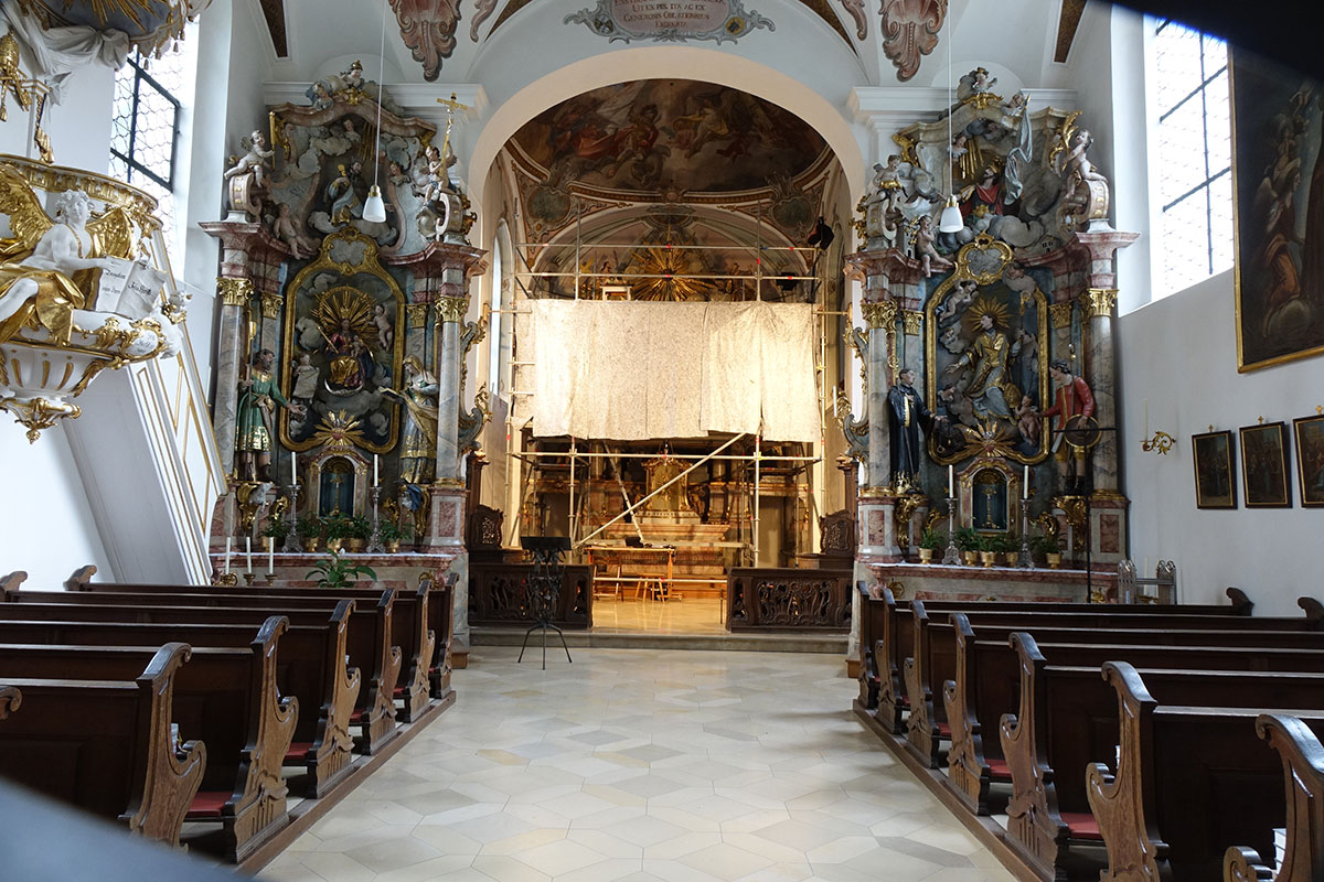 Najprije smo nastojali otkriti koji su dijelovi još uvijek u originalnom stanju te zbog čega su ostali dijelovi mijenjani. Pripremajući najnoviju restauraciju između 1996. i 2000. godine, Odjel za umjetnost pri Minhenskoj biskupiji je naručio zbirku povijesnih spisa. Ti su nam spisi, zajedno s povijesnim fotografijama i rezultatima našeg istraživanja, omogućili ustanoviti nekolicinu izmjena i gubitaka do kojih je došlo. Za vrijeme radova oltar i njegovi dijelovi ostali su in situ pa su tehničke mogućnosti istraživanja bile ograničene. Osvjetljavanje vezivnih materijala UV zrakama donijelo je mnoga nova saznanja. U 19. i 20. stoljeću oltar je restauriran četiri ili pet puta. Sredinom 20. stoljeća uklonjen je preslik iz 19. stoljeća, nanesen je pigmentirani vosak koji je kasnije uklonjen. Svakim restauriranjem mijenjala se struktura marmorizacije. Izvorni lak je uklonjen 1940. godine. Začudno je da se nakon svih tih intervencija još uvijek mogu vidjeti površine s originalnim tehnikama pozlate te slojevi polikromirani sredinom 18. stoljeća. Nadalje, moramo primijetiti kako se čini da su obrtnici koji su podigli ovaj oltar in situ i oslikali ga radili na vrlo osebujan i ekonomičan način, kakav se tijekom slijedećih stoljeća izgubio iz glava obrtnika. Daljnji cilj ovog pregleda je bio dokumentirati tragove originalnog rada J. B. Strauba i njegove radionice, što nam omogućava utvrđivanje njegove tehnike rada i alata kojim se koristio. Nakon donošenja početnih procjena, u Minhen-Bogenhausen su došli profesor Volker Schaible i diplomirani restaurator Peter Vogel, voditelj radionice za restauriranje pri Akademiji za konzerviranje i restauriranje u Stuttgartu, da bi se upoznali s našim istraživanjima. Tom prilikom rodila se ideja da bi gđica Rechenauer mogla napisati magistarski rad o istraživanjima dvaju glavnih otara Johanna Baptista Strauba, u Bichlu (1752. g.) i Bogenhausenu (1773. g.).