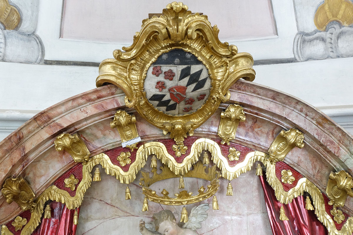 Iz arhivske građe znamo da je oltar izrađen između 1770. i 1773. godine. Grof August Joseph Toerring, vlasnik dvorca u blizini crkve, platio je Straubu 550 fl za njegovu izradu. Toerringovi su otac i brat bili članovi Viteškoga reda sv. Juraja, pa je možda zbog toga oltar posvećen sv. Juraju. Dva bočna oltara je izradio Ignaz Günther između 1774. i 1777. godine (Günther je umro 1775. godine): on je bio član Straubove radionice od 1743. do 1750. godine. Güntheru je za rad platio župnik Franz Georg Riedl. Glavni oltar prikazuje sv. Juraja na konju kako se bori protiv zmaja. Arhitektura oltara nalikuje na kazališnu pozornicu. Sa svake strane glavnog prizora stoje po dva stupa i jedan stub. Iza skulpturalne grupe nalazi se zid između dva stuba spojena lukom, a na njemu su prikazana vrata s raskriljenom zavjesom. Prikazan je anđeo kako kleči na oblaku. Ogromni nimbus zaklanja luk koji povezuje dva para stupova i stubove ispred pozornice. Iznad dva prolaza s lijeve i desne strane oltara stoje kipovi sv. Donata i sv. Irene. Kipovi Boga Oca i Njegovoga Sina prikazani su kako sjede na vrhu oltara. Anđeli i krilate anđeoske glave slikovito su razmiješteni po oltaru. Oltar i skulpture na njemu izrađeni su od drveta i polikromirani.