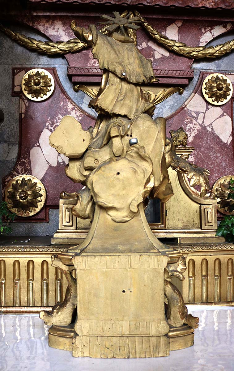 - Rear of the sculptural group, detail with the missing wing of the angel (photo by Julia Strobl, 2018)