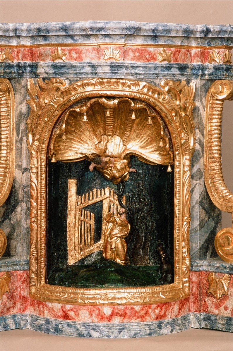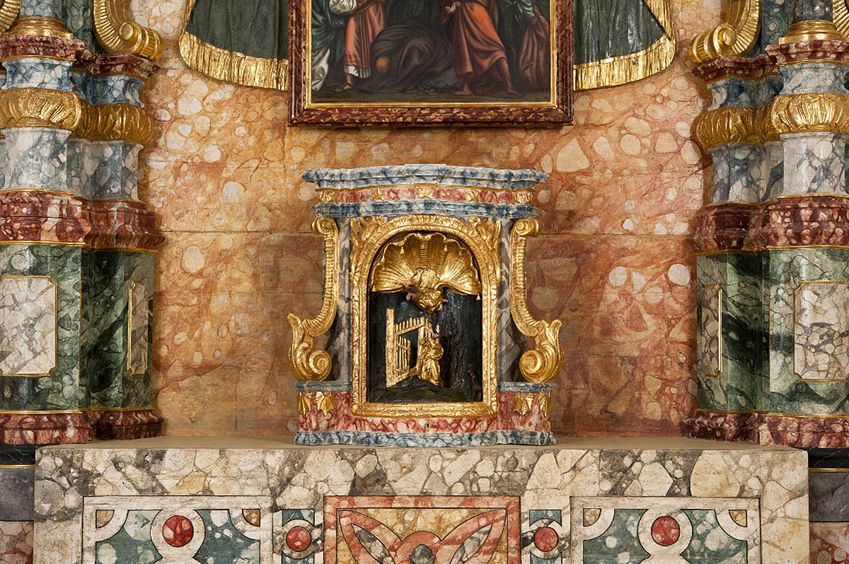 The altar was attributed to Franz Anton Straub by the art historian Doris Baričević based on comparison with the sculptural work of his brothers.3 The tabernacle originates from the same time and is attributed to the same sculptor. The tiny figures of Jesus and a flying angel on the Mount of Olives are placed in its niche, but the sculptures of adorning angels no longer exist.