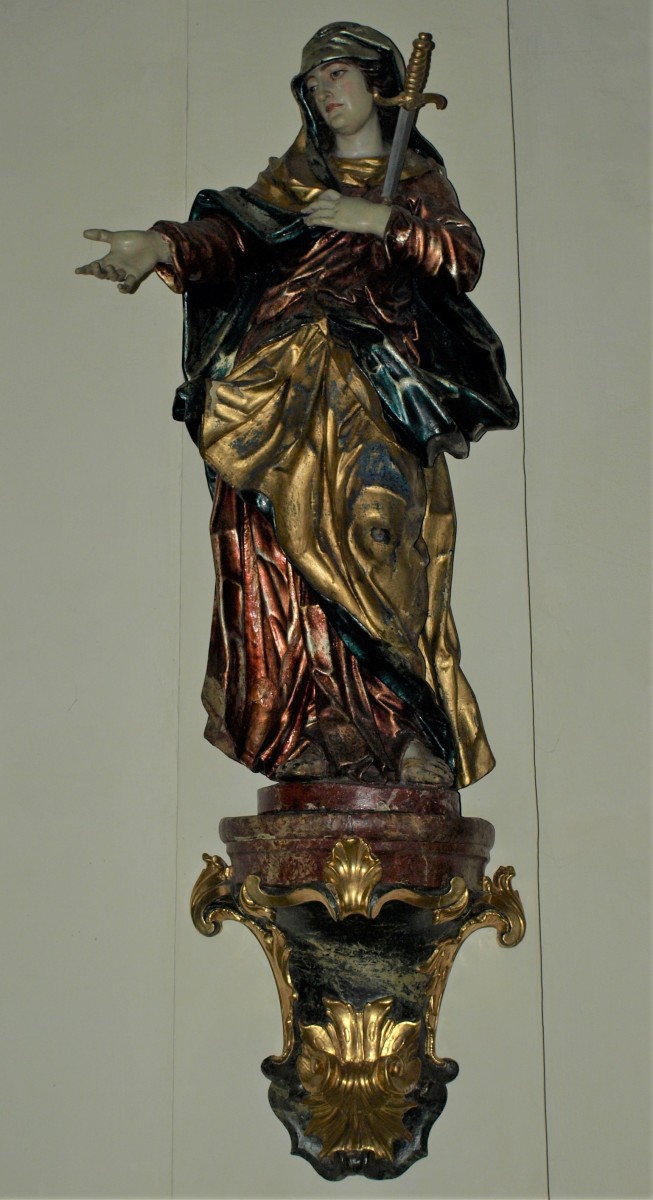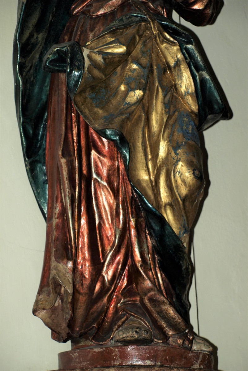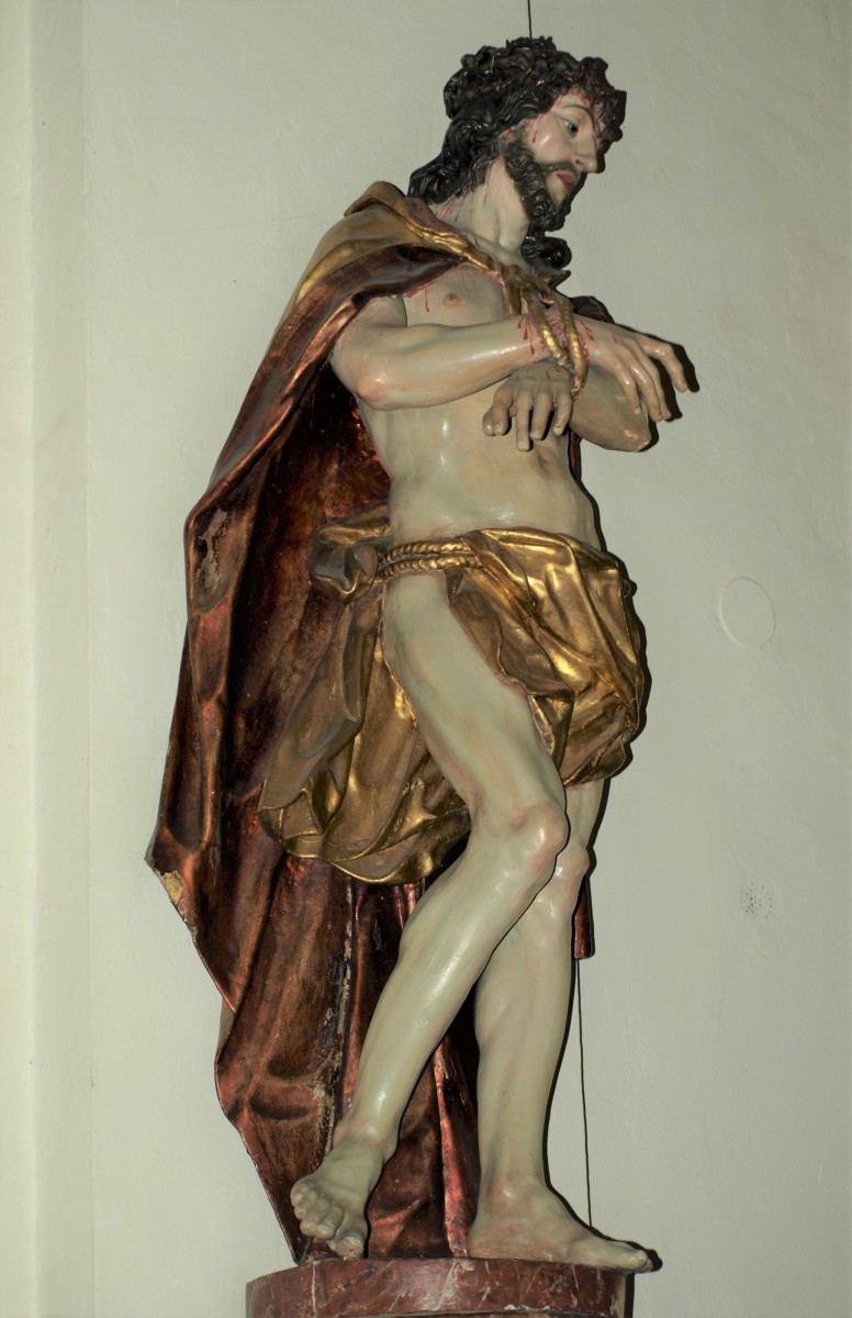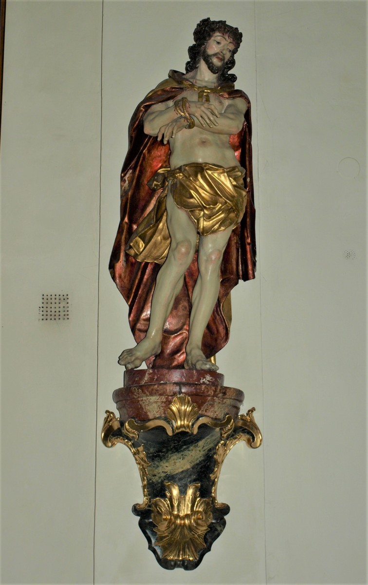 The sculptural group depicting Ecce Homo and Mater Dolorosa was created by Philipp Jakob Straub between 1740 and 1750.1 The statues are located left and right of the church’s triumphal arch on two remarkable baroque consoles. On the left one, Christ is standing with tied hands and the crown of thorns on his head. His right leg is stretched aside in an unnatural way and his standing motif appears quite unstable. The head is turned to the left side and shows big eyes with a sorrowful expression. It is a highly realistic depiction, strengthened by the drops of blood trickling out of the wounds. The Mater Dolorosa – his counterpart on the right side – shows the same sensitive expression on her face with tears trickling down her big eyes. Her right hand is outstretched, while the other one is led to the heart in which a sword is sticking. She is wrapped in several layers of flowing draperies.