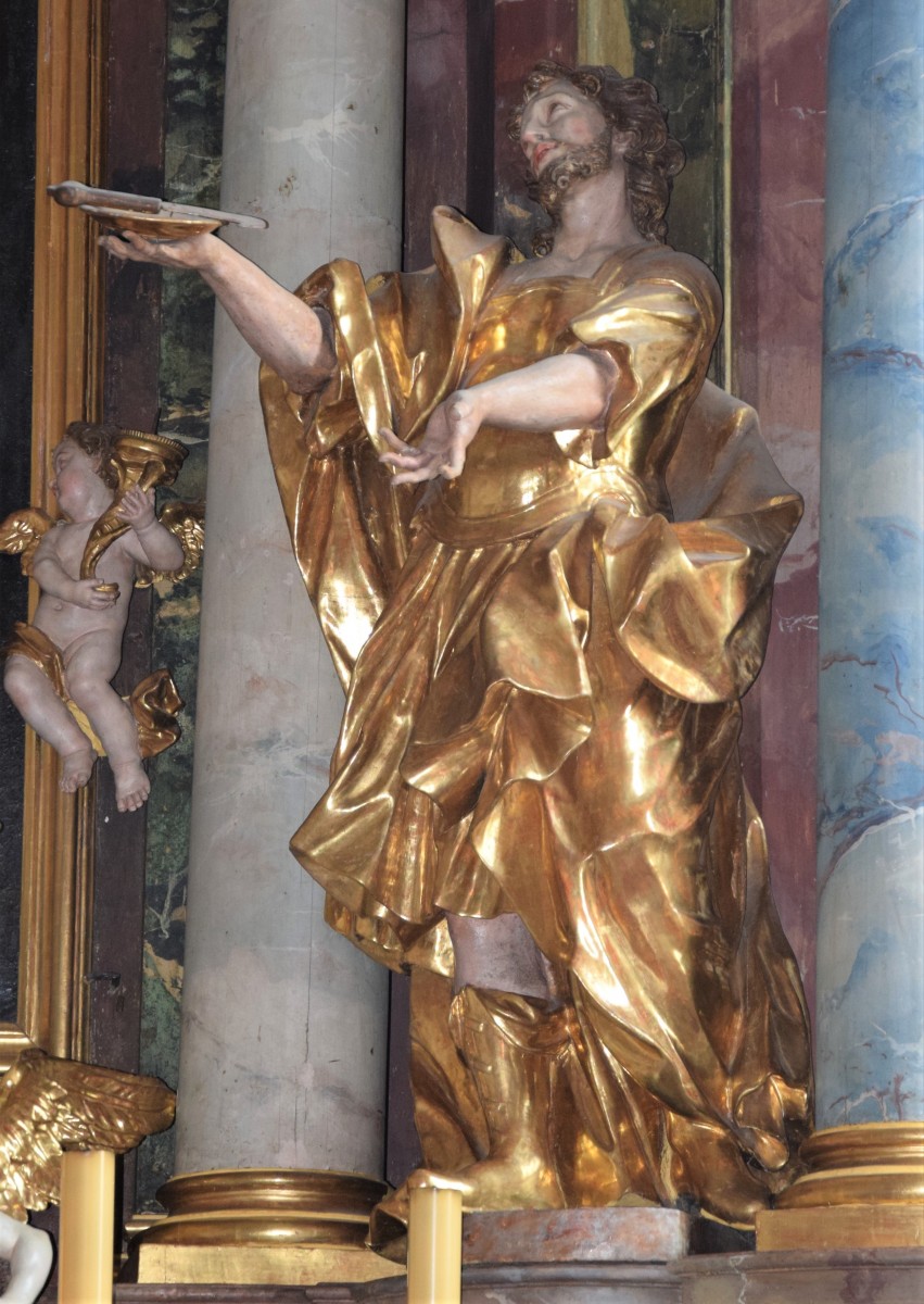 The four sculptures of the high altar were created by Philipp Jakob Straub in 1736.1 They are attributable to the artist’s early style which already shows tendencies of his later sculptural type. It is characterised by a precise composition of body, clothing and physiognomy, the forward moving of the free leg as well as an expressive gesture. A striking fact is the more demotic and more narrative figural style of the sculptures of St Peter, St Jacob, St Donate and St Paul.2 Far left there is the depiction of St Peter, standing on a volute-shaped corbel. The left hand holds the keys, the right hand an inverted cross. His counterpart on the other side is St Paul with the typical attributes (book and sword) in his hands. Here, the comparison to Margrave Leopold of the altar of St John of Nepomuk of the parish church in Graz is obvious. Both show the same opulent mass of dark hair and beard, the same bulging eyes and shaping of the nose. Left and right of the high altarpiece there are St Jacob the Elder with pilgrim’s staff and hat as well as St Donate, who seems to offer a bowl with a knife on it to the patron saint on the high altarpiece, St Nicholas. The expressive gesture is highly remarkable, as is the rich drapery of his clothing.