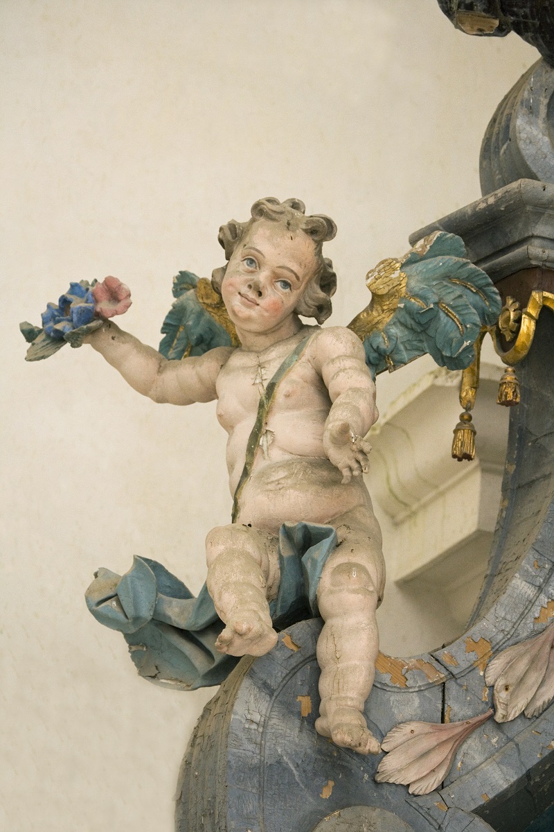 - The top of the altar The sculpture of angel from the atic (Institute for the Protection of Cultural Heritage of Slovenia, photo by Valentin Benedik, 2018)