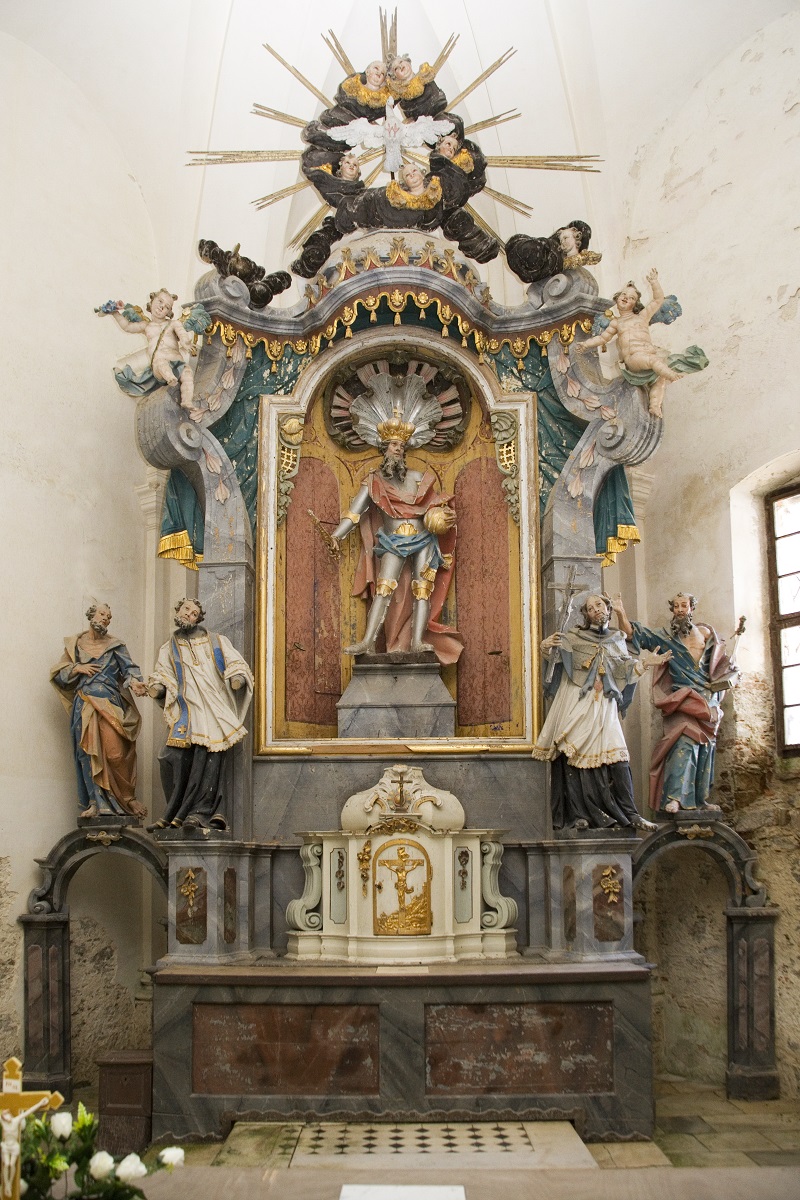 The high altar is made of wood. The altar table is made of stone and it is covered with non original wooden antependium. The altar is completely repolychromed.