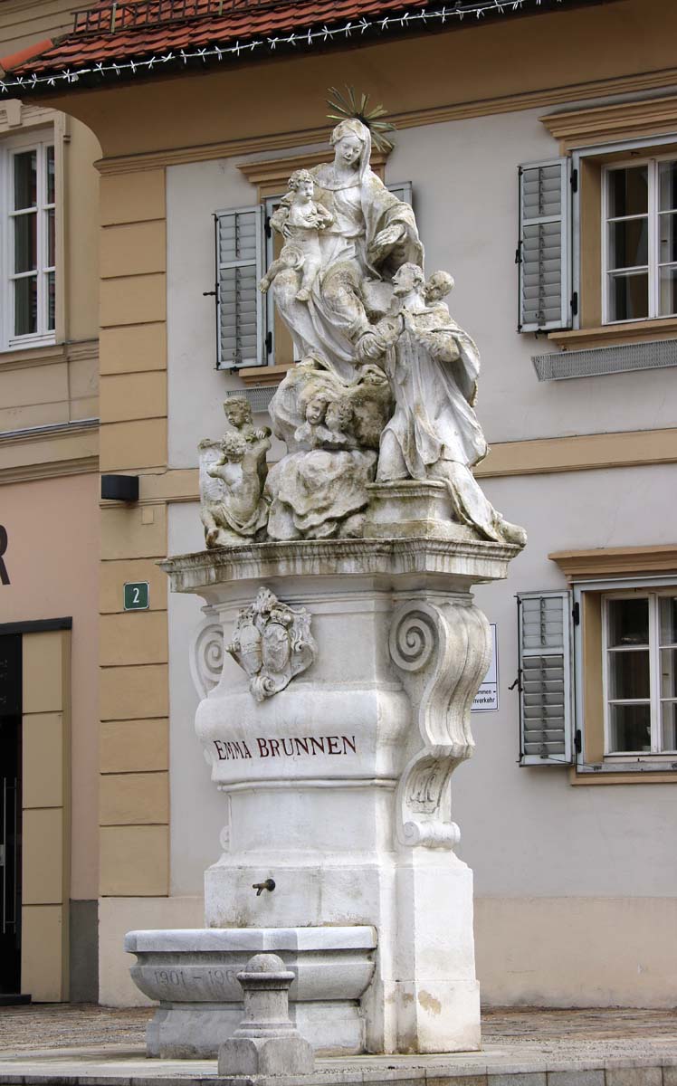 Dipl. Rest. Heinz Hübl undertook a restoration and preservation of the sculptures of the Emmabrunnen in 1984. One hand of St Mary had to be rebuilt.