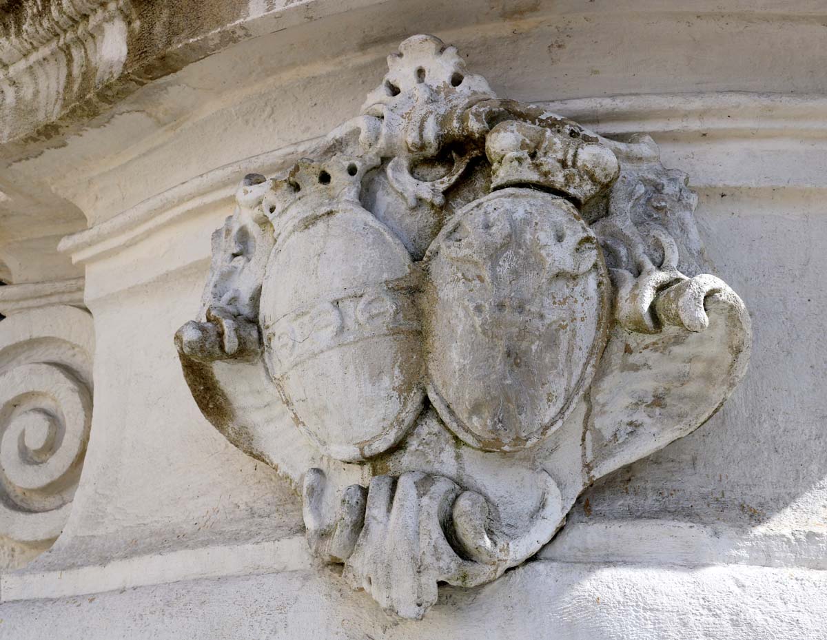 The sculptural group depicting St Mary and child worshiped by St John of Nepomuk was erected on the site of the former benefice church („Benefiziatskirche“), a small court chapel of the Eggenberg family, where mass was held before the new parish church was finished.1 The chapel was demolished around 1750, perhaps after the consecration of the new parish church in 1754. The alliance coat of arms "Eggenberg-Leslie" on the pedestal (fig. 2) refers to Princess Maria Theresia of Eggenberg and Carl Cajetan Count Leslie, the new owners of Eggenberg since 1755. A payment to a stonemason for 5 1/2 days work at the "S. Nepomucene" in the account book of the parish (1753) may refer to the pedestal of the sculptural group.2 In 1901 a water supply was installed in Ehrenhausen due to the donation of Emma von Lutheroth. The 18th century monument in front of the church was converted into a fountain and named "Emmabrunnen" after the benefactress (Ins. 1 and 2). Peter Stauder dates the monument around 1750, he names Veit Königer as author of the sculptures - without any archival confirmation.3 Königer came to Graz around 1754. Horst Schweigert attributes the sculptural group to Philipp Jakob Straub around 1752-1755 only due to stilistic reasons and the high quality comparable to the sculptures of the church façade.4 The attribution to Philipp Jakob has to be questioned because of a newly found evidence that his brother Joseph Straub from Marburg worked for Ehrenhausen shortly before his death in 1756. A collaboration of the brothers is also possible.5