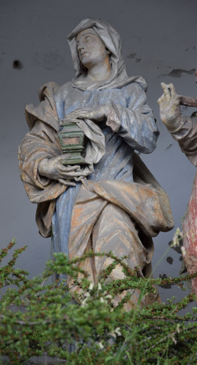 The sculptural group depicting the Three Carriers of the Anointing Oil (Mary Magdalene, Mary, mother of Jacob and Salome) is presented in the last chapel of the round tour, directly next to the Entombment of Christ. They stand facing each other with an ointment vessel in one hand. The artful drapery of their clothing refers to Straub as executing artist as well as the mannered posture of especially the little finger. The remarkable bowl-shaped fold of Mary’s cloak that is formed by a strap, holding it by the hip also indicates Straub’s style.
