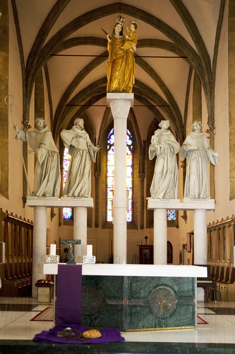 The high altar (as well as the church and the monastery) was demolished in the bombing in 1945. Before the demolition, France Stele took some photographs during the restoration works in the church. The preserved photographs allow us to determine the original appearance of the altar. We can see that the altar had a massive architecture with three pairs of columns on each side of the altar`s painting depicting St Peter and St Paul. Between the columns, there were four (more than life size) sculptures of four franciscan saints (St Louis of Toulouse, St Francis of Assisi, St Anthony of Padua, St Bonaventure) and two putti. In the upper part was a niche with a medieval statue of Virgin Mary with a child, which was recarved by Joseph Straub and then placed on the high altar. In the upper part there were two pairs of larger kneeling angels while above the columns and on the very top of the altar, there was a sculpture of lying God the Father with a globe and a dove of the Holy Spirit. There were many smaller angels and angel heads in the upper part as well – representing heavenly glory. We should also point out eight reliefs, which were fixed on the basis of the columns and depicted the scenes from the life of St Peter and St Paul (from left to right): the Crucifixion of St Peter, the Liberation of St Peter, St Peter healing a man, St Peter fishing, the Conversion of St Paul, the meeting of St Peter and St Paul, the stoning of St Paul and the beheading of St Paul. The altar had a tabernacle with two angels kneeling on the volutes and four small putti. All four sculptures of saints of the minorite order survived and were placed on the high pedestals above the main altar (together with the copy of the statue of St Mary) after the restoration by Viktor Gojkovič in 2005. The sculptures of putti, which were saved, are on display in the chapel of St Anthony of Padua in the church. There is also a fragment of the altar`s architecture saved, where layers of polychromies are well seen.