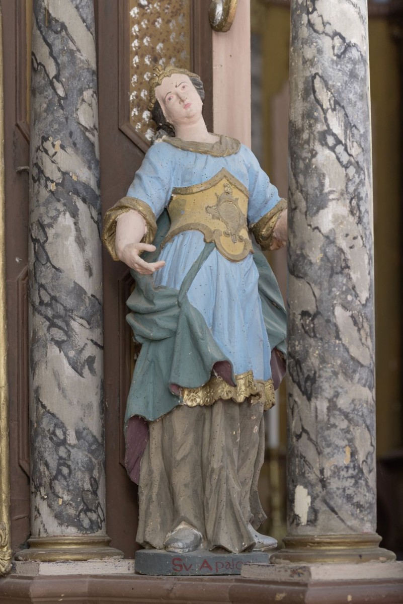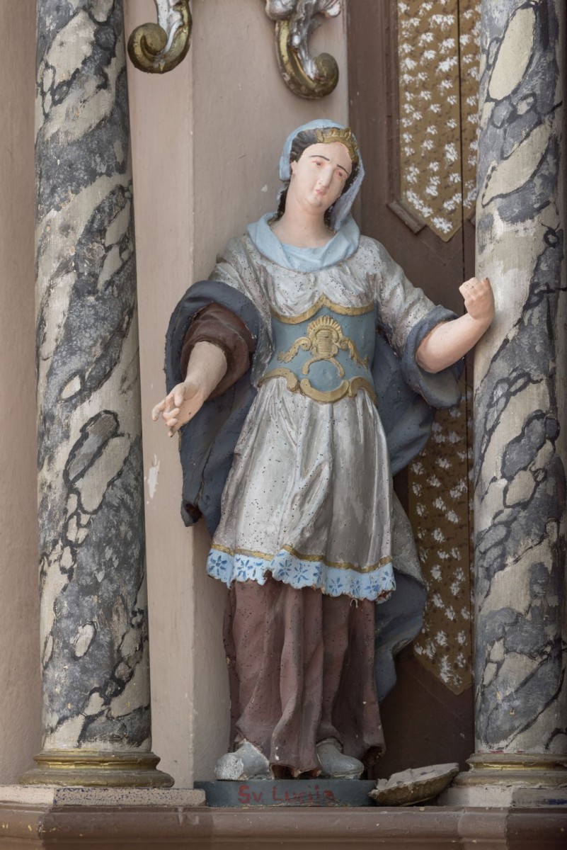 In 2018, however, Martina Ožanić attributed the altar and its sculptures to Franz Anton and his workshop. 5 Due to several layers of repolychromy, and especially due to the last repolychromy of poor aesthetic qualities, it is difficult to discern the details of artistic expression. However, the sculptures of Saint Lucy and Saint Apollonia bear considerable similarities in facial features and costumes to the sculptures of St Catherine and St Barbara (St Elizabeth of Thuringia) on the side altar of Saint Anna in Čučerje, which have been attributed to Franz Anton Straub. Whether they are the work of the master himself or his workshop might be revealed after conservation-restoration works. Lower quality of the sculptures of putti on the attic indicate they were probably carried out by an unknown assistant in the workshop.