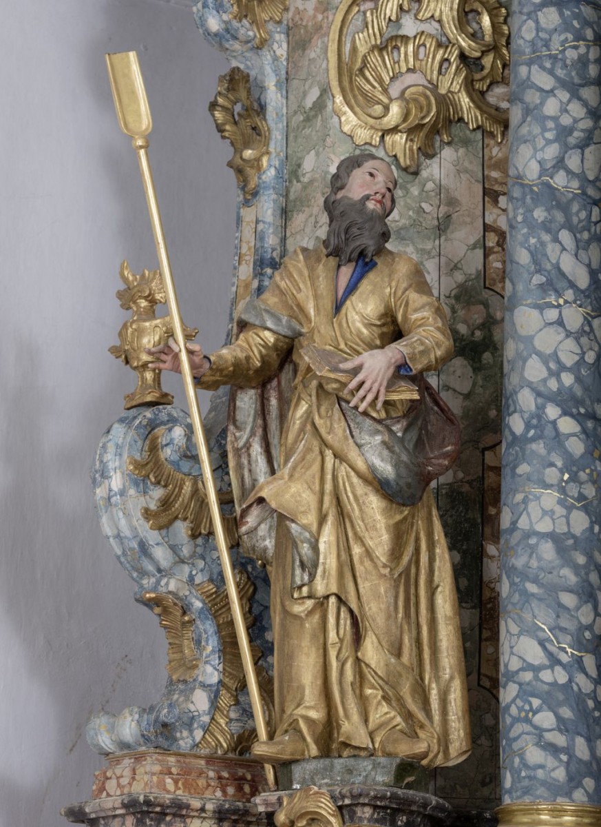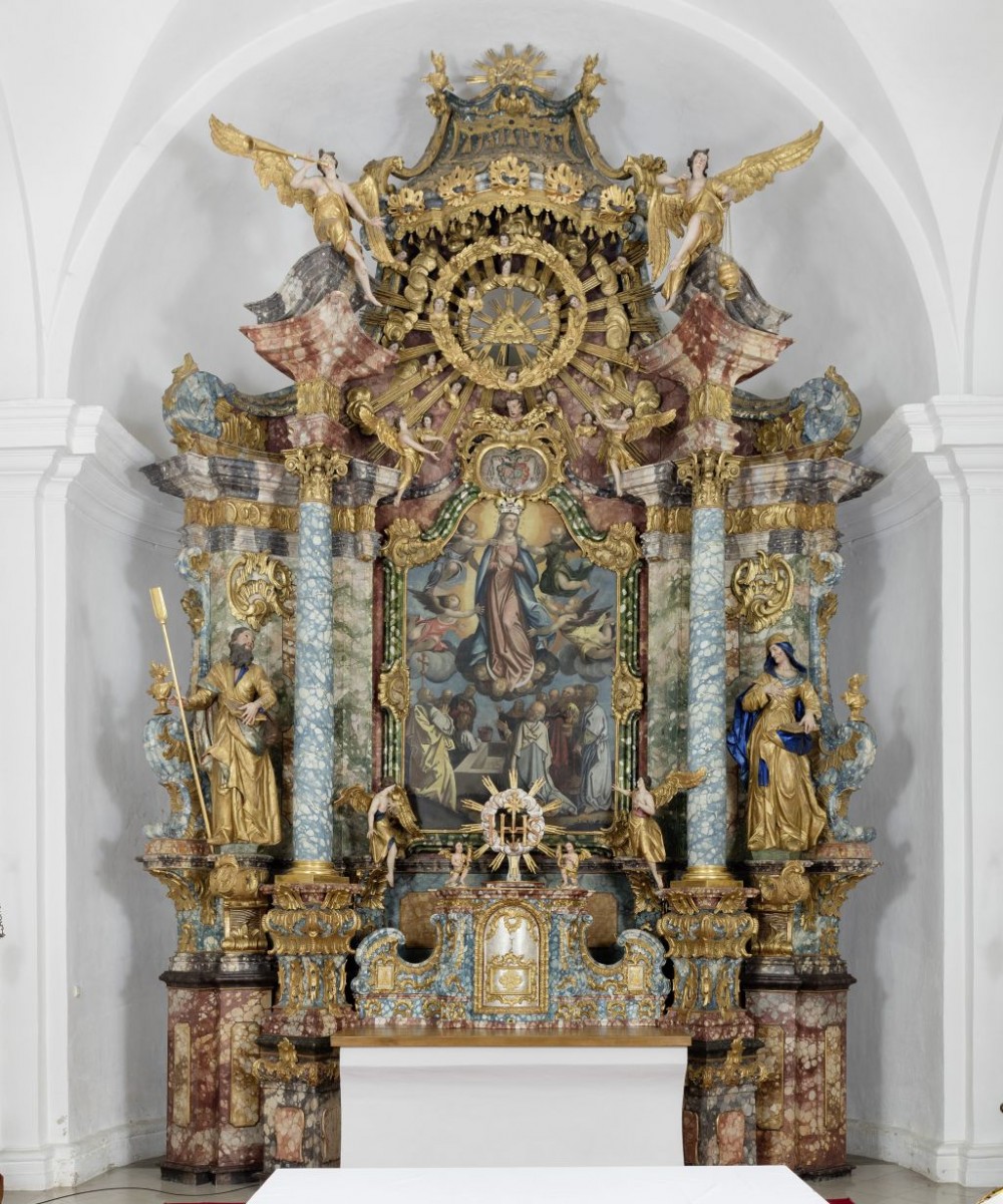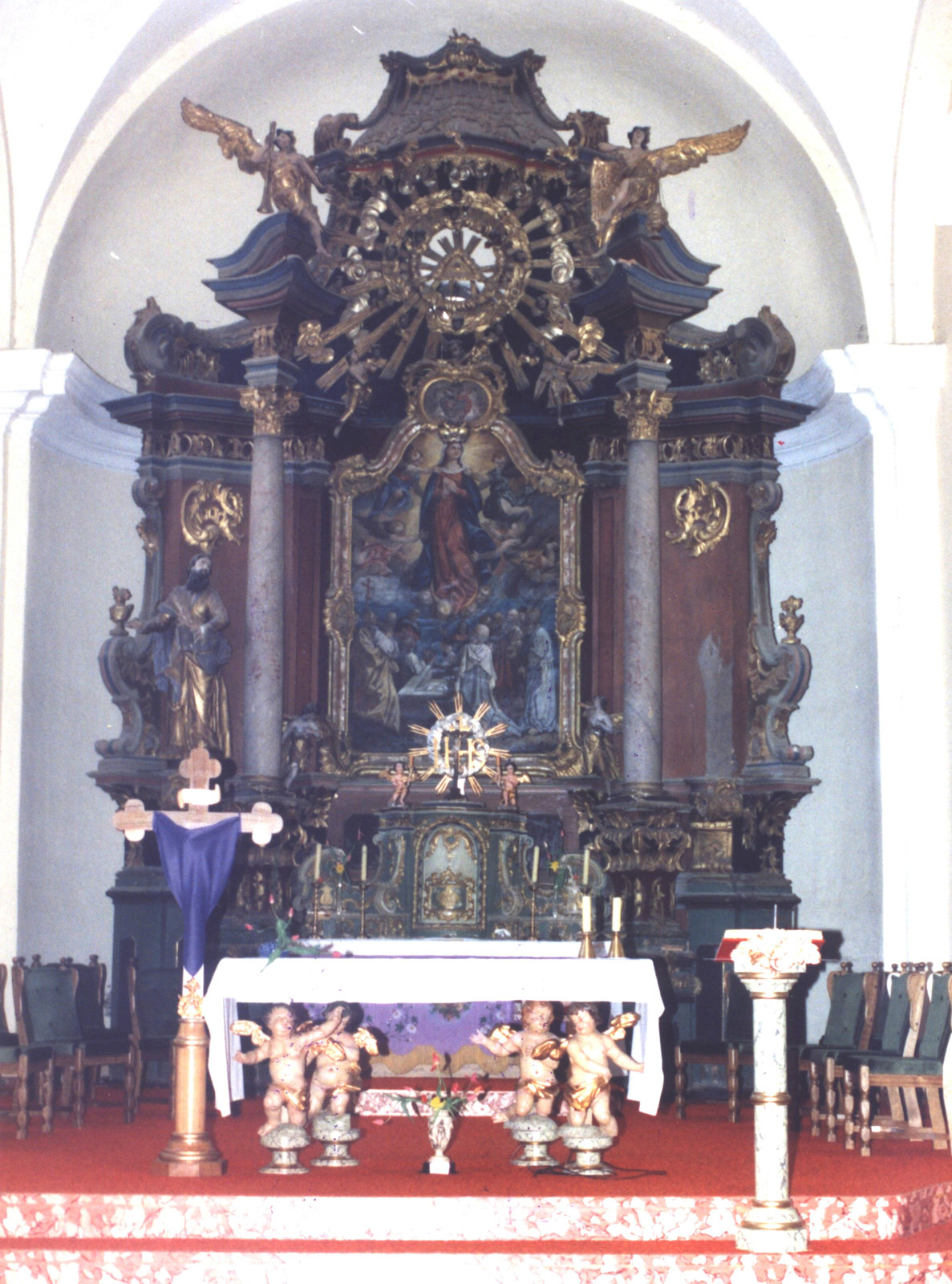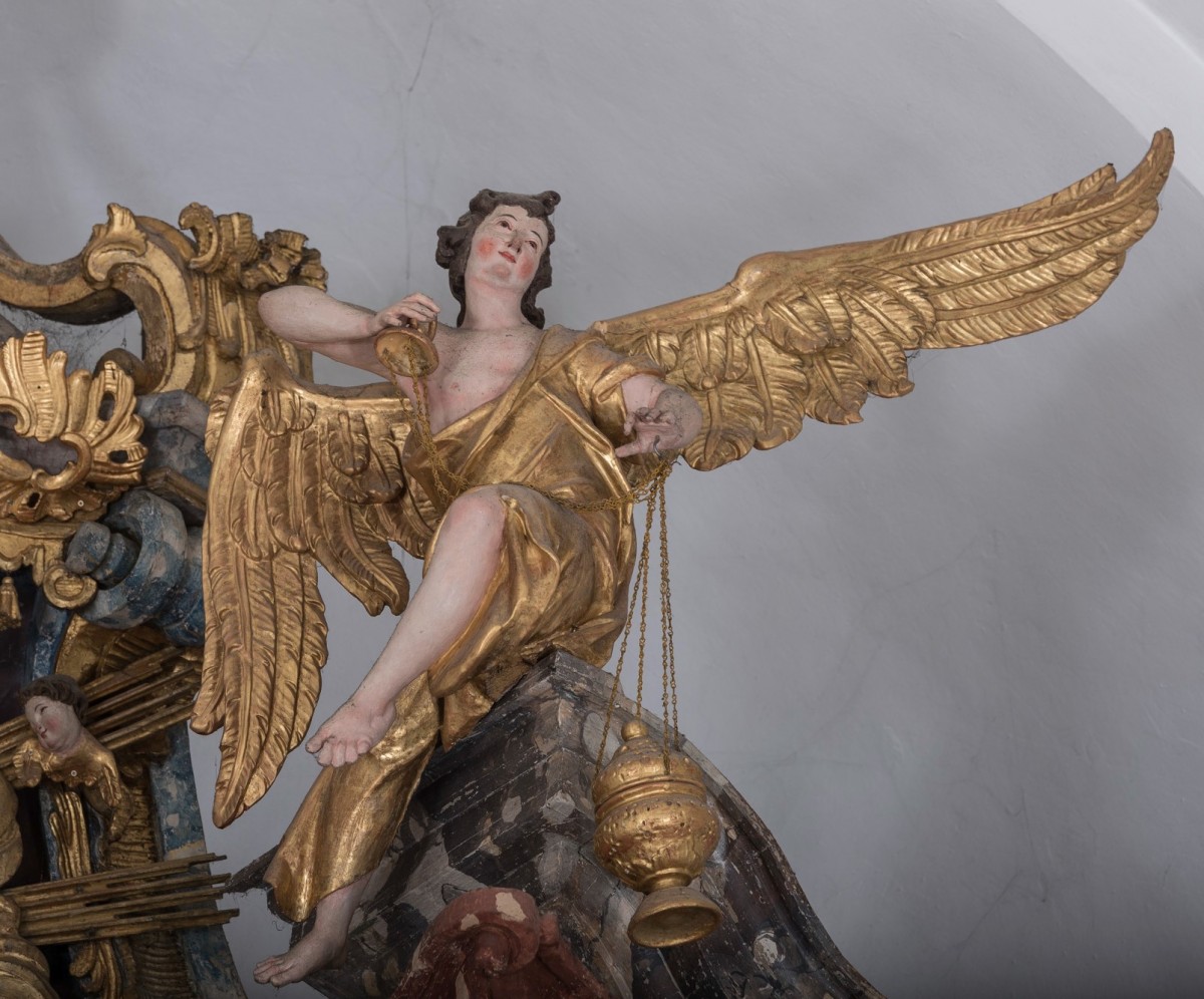 The altar was first mentioned in the canonical visitation of 1761. At the time, the old altar was still standing in the presbytery, but a larger altar, and proportional to the dimensions of the sanctuary, was being created, as a gift of the Bishop of Zagreb, Franciscus Thauszy. 1 In 1765, it was already standing, completed with the polychromy. 2 The coat of arms above the painting reveals the donor Franjo Thauszy, the Bishop of Zagreb (Ins. 1). The painting dates from1644 and originates from an earlier altar. It was a devotional gift from a lady who recovered from a serious illness.3 This original painting had been replaced by a new one made by Johann Beyer in 1851, 4 but later the old painting was returned to the altar.5 The art historian Doris Baričević attributed the sculptures to Franz Anton Straub by on the basis of stylistic resemblance to the works of his brothers. 6 The tabernacle is similar in style to the altar. The upper part of the tabernacle used to be a baldachin with a curtain. The window behind the two concentric circles of the attic that surround the triangle of the Eye of Providence used to be gin lazedyellow. In the past, four angles encircled the Eye of Providence.