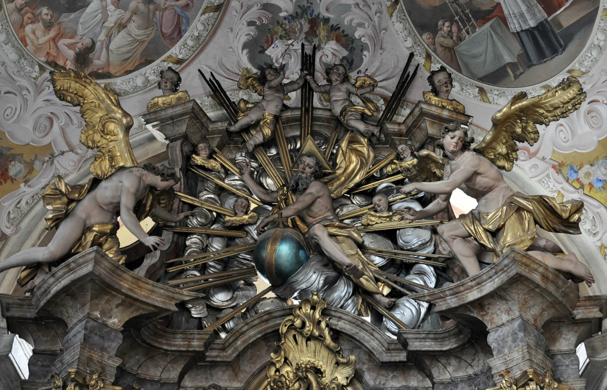 Sergej Vrišer attributed the altar to Joseph Straub on the basis of stylistic analysis.1 In 1957, he pointed out the significant similarities between the sculptures of two angels from the attic of the altar in Selnica ob Dravi and two angels from the high altar from the church of St Peter and Paul in Ptuj, which is a documented work of Joseph Straub.2 In 1993, Vrišer later also pointed out the significant similarities between the sculpture of God the Father from the altar in Selnica ob Dravi and the respective sculpture from the high altar from Studenci (today in Regional Museum Maribor).3 Based on this comparison, he also suggested the dating of the altar in 1750s.4 The sculpture of Mary and Child in the central niche of the altar is not by the same sculptor.
