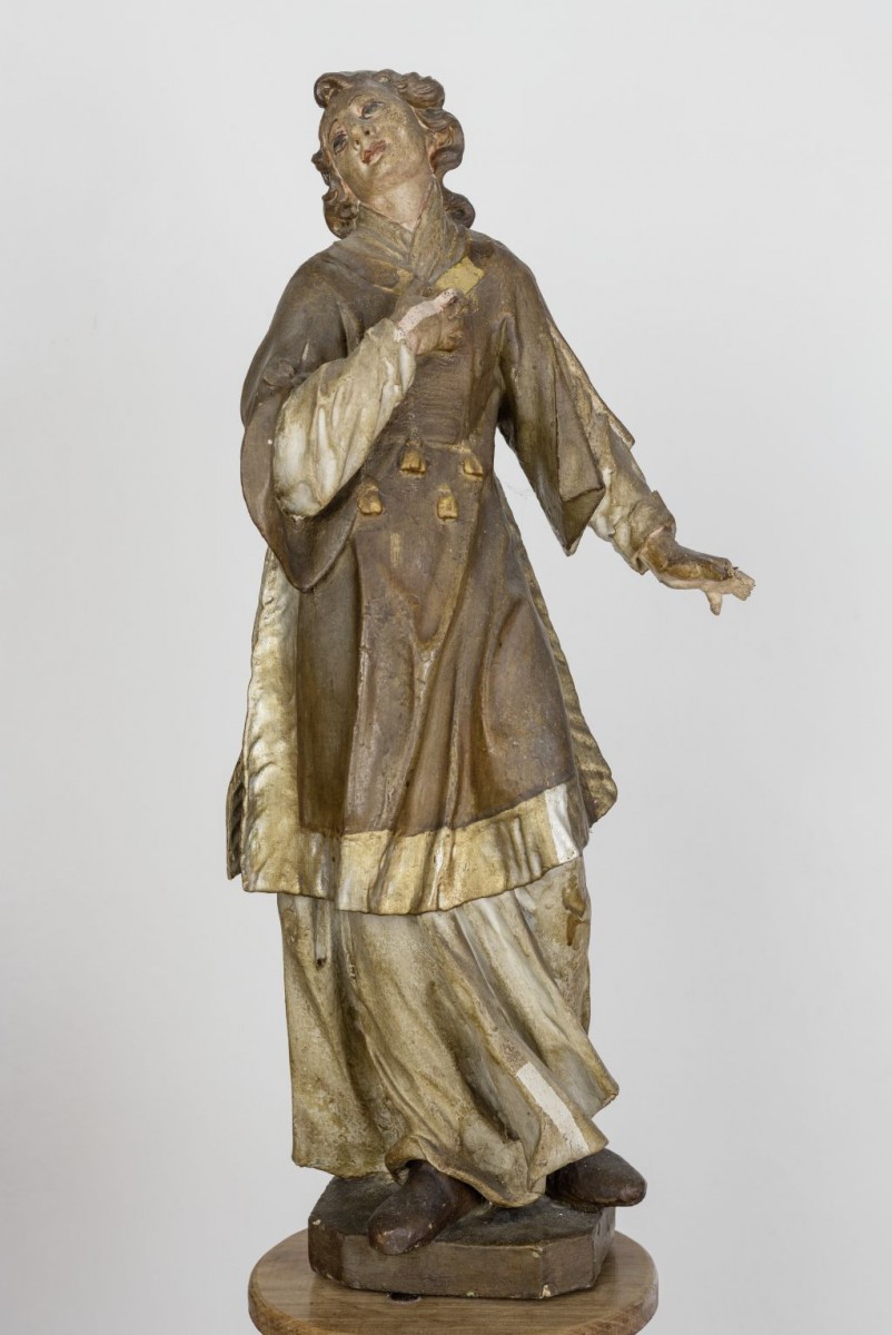 Of all the sculptures in the parish church, the sculptures of Saint Lawrence, Saint Joseph, Saint Sebastian and the small putto bear resemblances to Franz Anton Straub's style. The sculpture of Saint Lawrence, now on the side altar of Saint Anthony of Padua, was attributed to Franz Anton Straub by Doris Baričević, who commented it had all characteristics of his style. 4 The sculptures of Saint Joseph and Saint Sebastian on the high altar have not been attributed yet, but their stylistic features share similarities with the sculptures attributed to Franz Anton Straub and his workshop. Furthermore, the sculpture of Saint Sebastian, particularly his pose and the way his curled lock of hair falls on his shoulder, is similar to the figure of the same saint in Egervár, attributed to Philipp Jakob Straub (now in the Museum of Fine Arts in Budapest, Inv. no. 4963). 5 However, the sculptures were heavily repainted during the 1970s or 1980s so that it is difficult to discern the quality of their artistic expression.