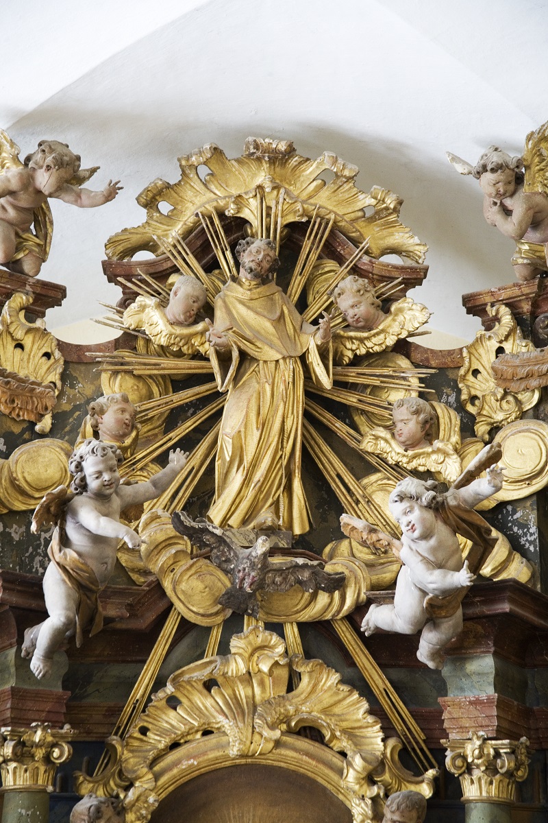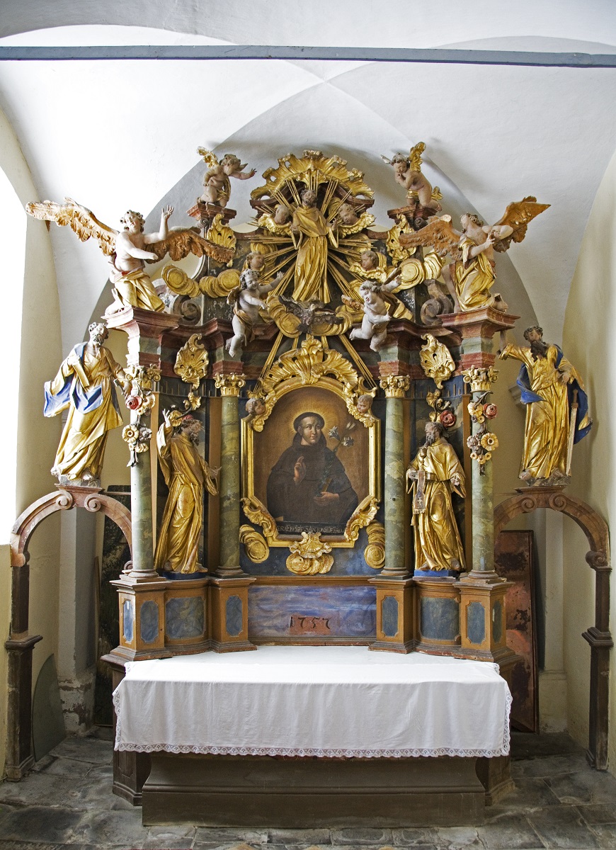 In the centre of the altar, there is a painting of St Anthony of Padua of unknown painter, in a massive frame with shell ornaments and two angel heads. On the right side, there is a sculpture of St Bonaventure with a chalice, and a sculpture of unknown saint on the left side. Above the side openings, there are sculptures of St Peter (on the left) and St Paul (on the right). In the upper part of the altar, there is a sculpture of St Anthony of Padua with two big kneeling angels on the sides, four putti, four angel heads and a dove of the Holy Spirit. The ornamentation of the altar with wreath of roses and a roccaile is massive. The postures and gestures of the sculptures on the altar are all rather expressive compared to the other works of Joseph Straub. Because of the same iconography of the sculptures (monks) the comparison with the sculptures from Ptuj and Celje is the most appropriate one. One should also point out that the drapery of the sculptures has significant creases and big open sleeves – a characteristic that can be observed in some other sculptures in Joseph Straub opus.