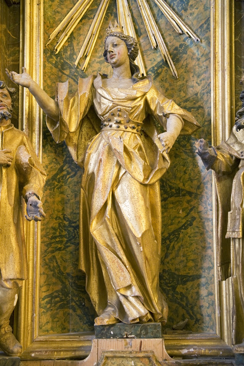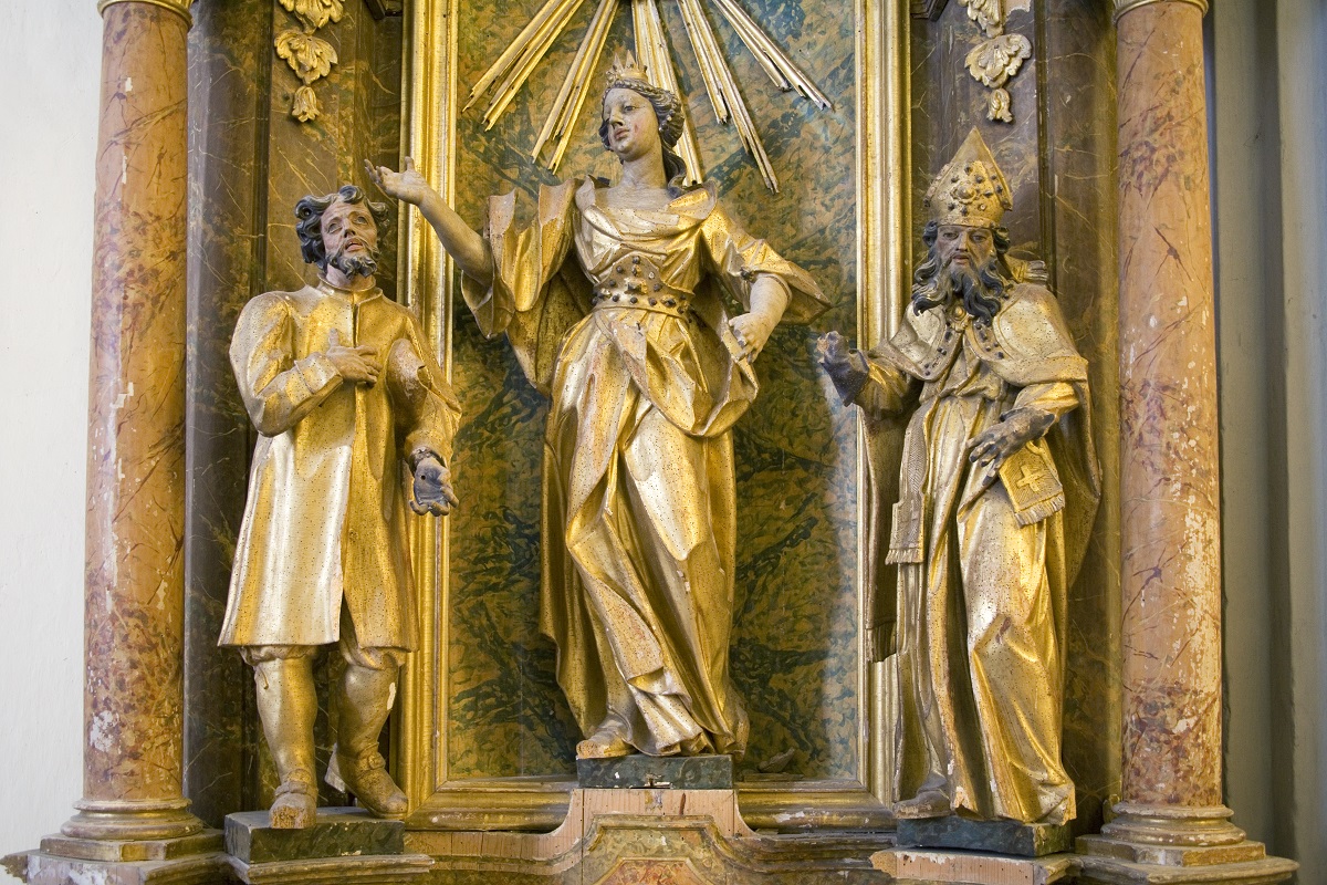 In the central niche, there is a sculpture of St Lucy (she used to hold a plate with her eyes in her hands). On the left, there is a sculpture of St Isidore the Laborer and a sculpture of St Augustine on the right. In the upper part of the altar, there is a sculpture of St Apollonia (she used to hold a tongue with a tooth in her hands). According to the old descriptions of the altar, there were two angels on the sides of the attic and two groups of three angel heads above both female saints, but these are all lost today. The two wooden candlesticks, which used to be placed on the altar, are also missing.4 Both female saints (St Lucy and St Apollonia) share several similarities with other works by Joseph Straub, for example with the sculptures of St Anne and St Elisabeth from Studenci (documented works of Joseph Straub; today in Regional Museum Maribor). They all have similar hairstyles with hair bound at the back of the head, and a curly lock of hair at the side, big half-open and almond shaped eyes, round chin with a dimple in the middle, and, finally, rich dresses with significant creases.