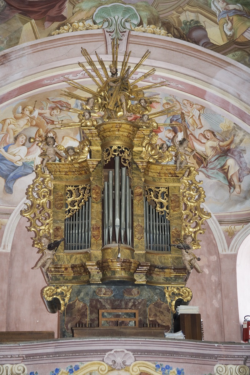 - The organ case in the Pilgrimage and Parish Church of St Mary and St Margaret the Virgin in Sladka gora (Institute for the Protection of Cultural Heritage of Slovenia, photo by Valentin Benedik, 2018)