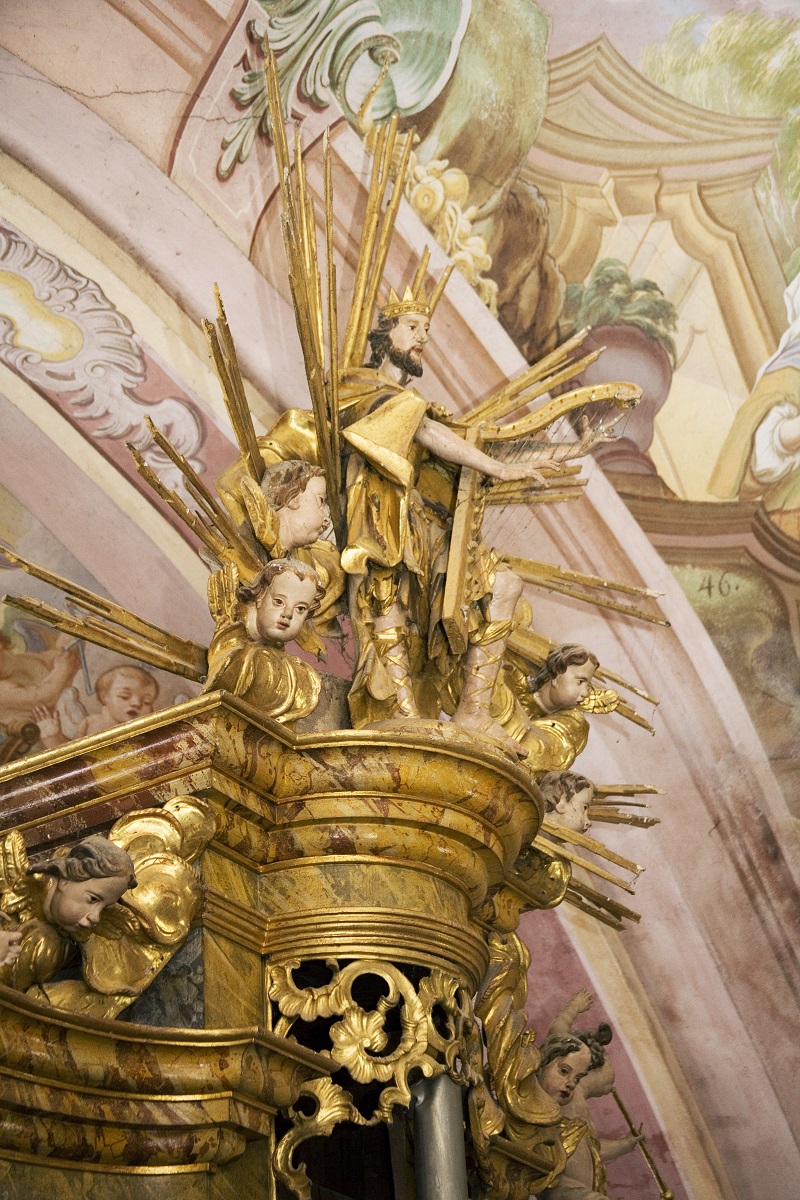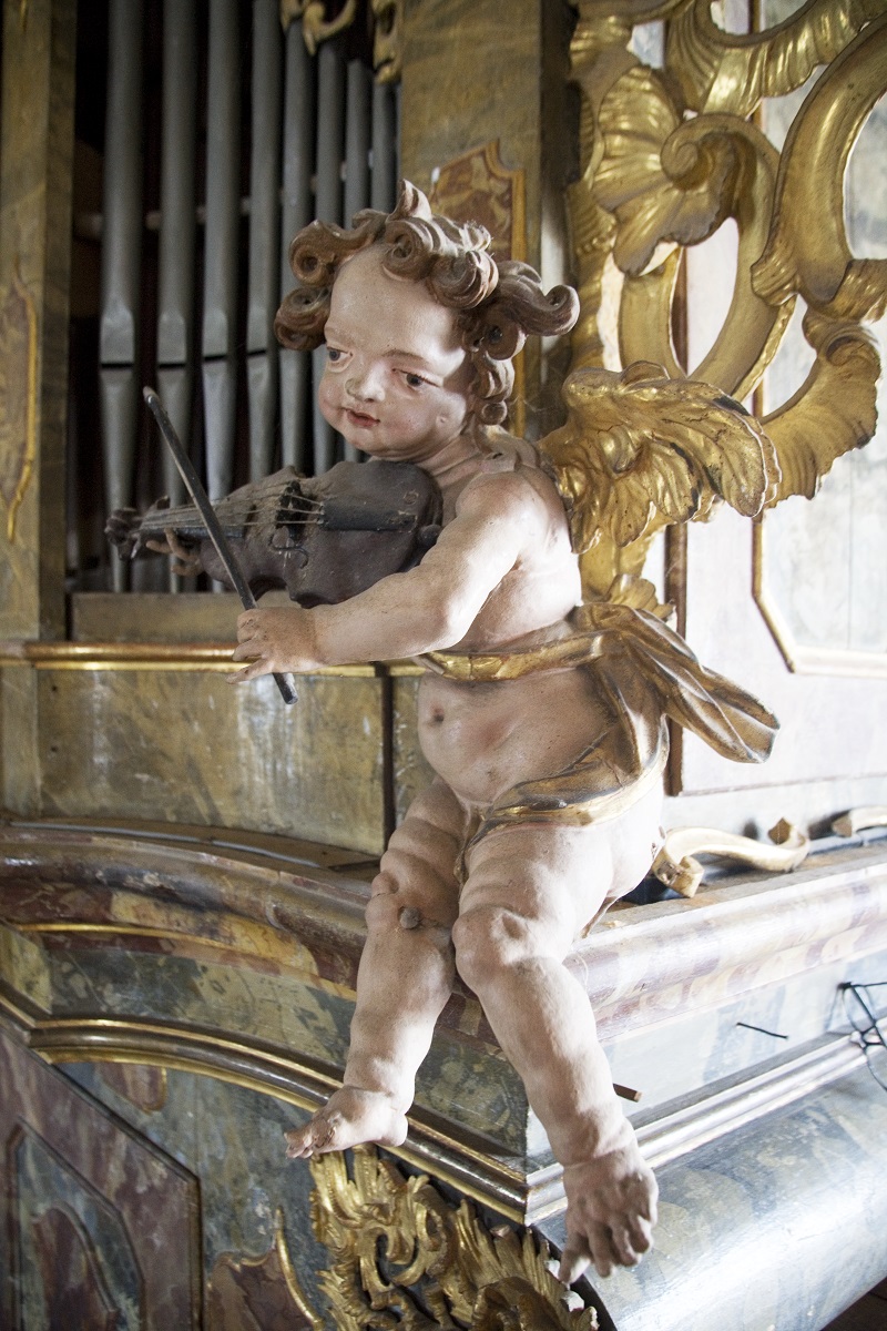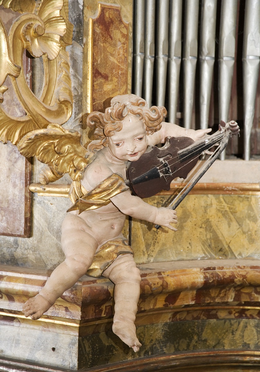 There are four putti on the sides of the organ case: the lower two play violins, while the upper two play trumpets. All the sculptures share significant similarities with Joseph Straub`s work: curly hair, round cheeks and big open eyes.