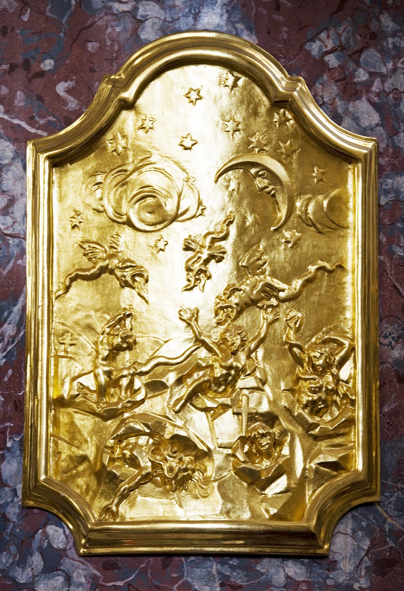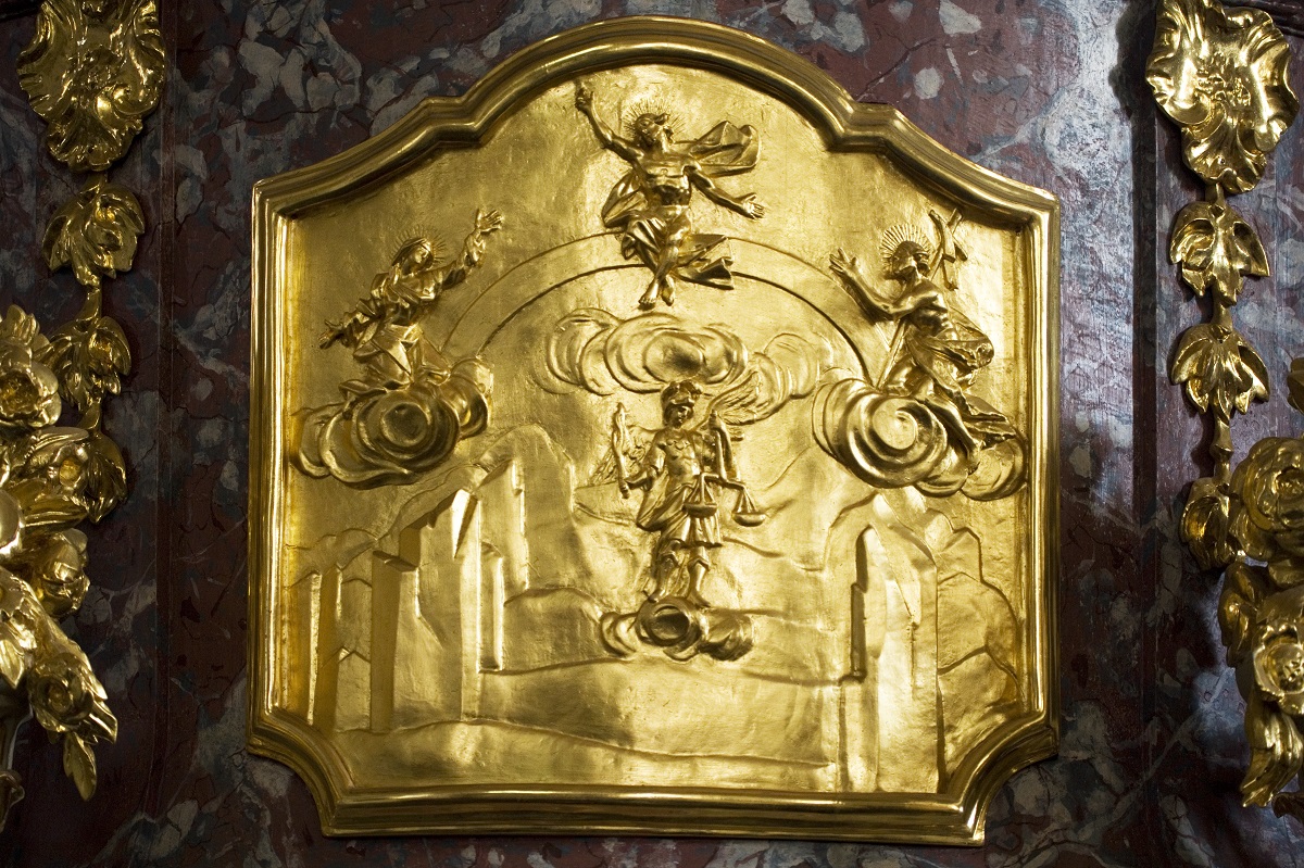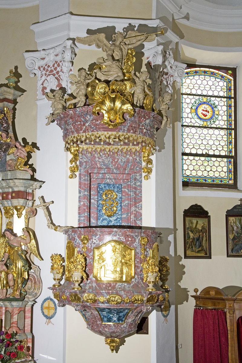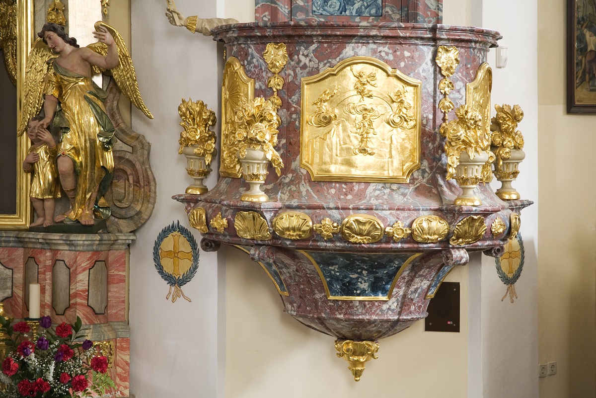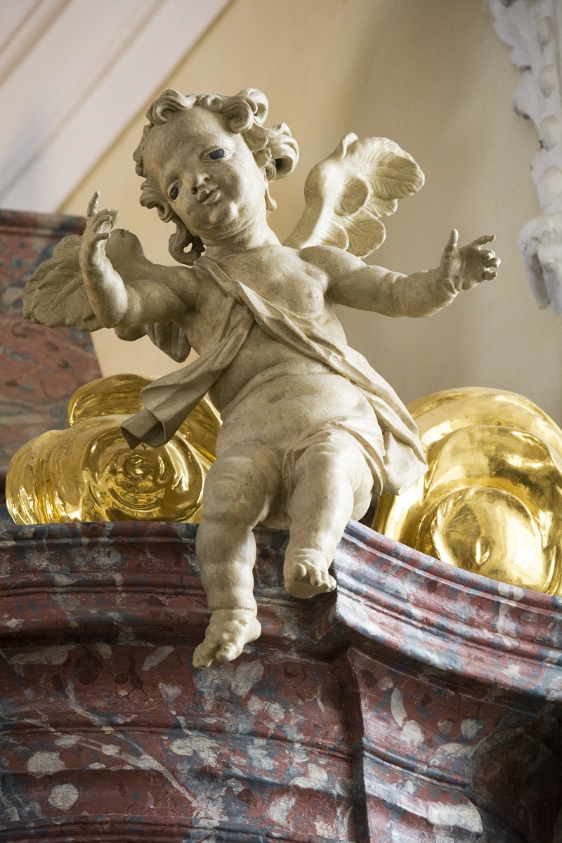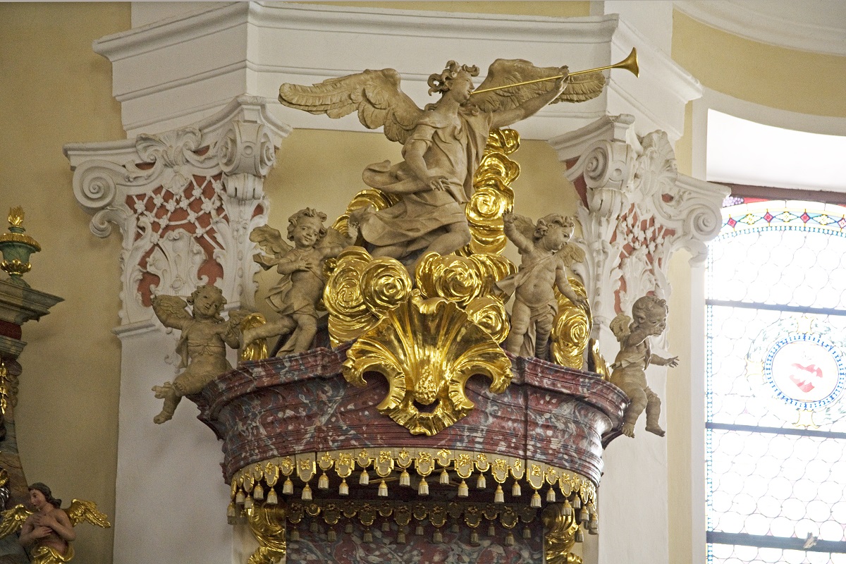 The body of the pulpit is decorated with four vases with flowers and reliefs between them. The relief in the middle depicts the Last Judgement, while the reliefs on the sides depict the Resurrection of the Just and Unjust.2 On the canopy of the pulpit, there is an angel with a trumpet, surrounded with four putti and clouds. The angel and putti show significant similarities with other works by Joseph Straub (curly hair, big open eyes).