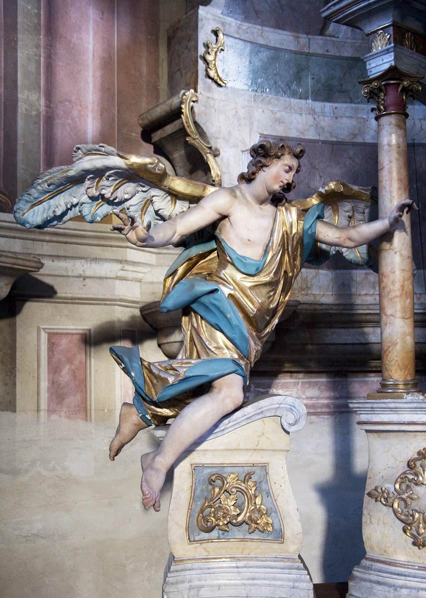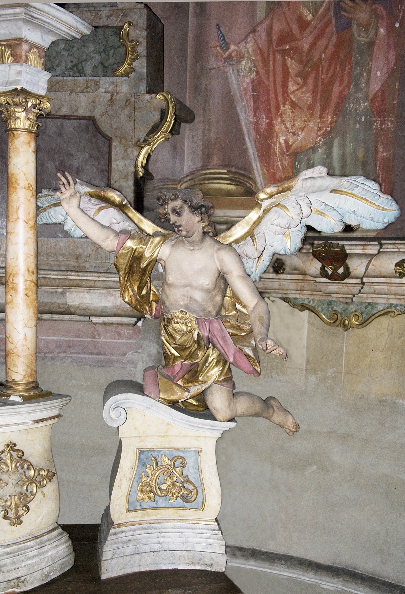 The sculpture of the left angel on the tabernacle (Institute for the Protection of Cultural Heritage of Slovenia, photo by Valentin Benedik, 2018)