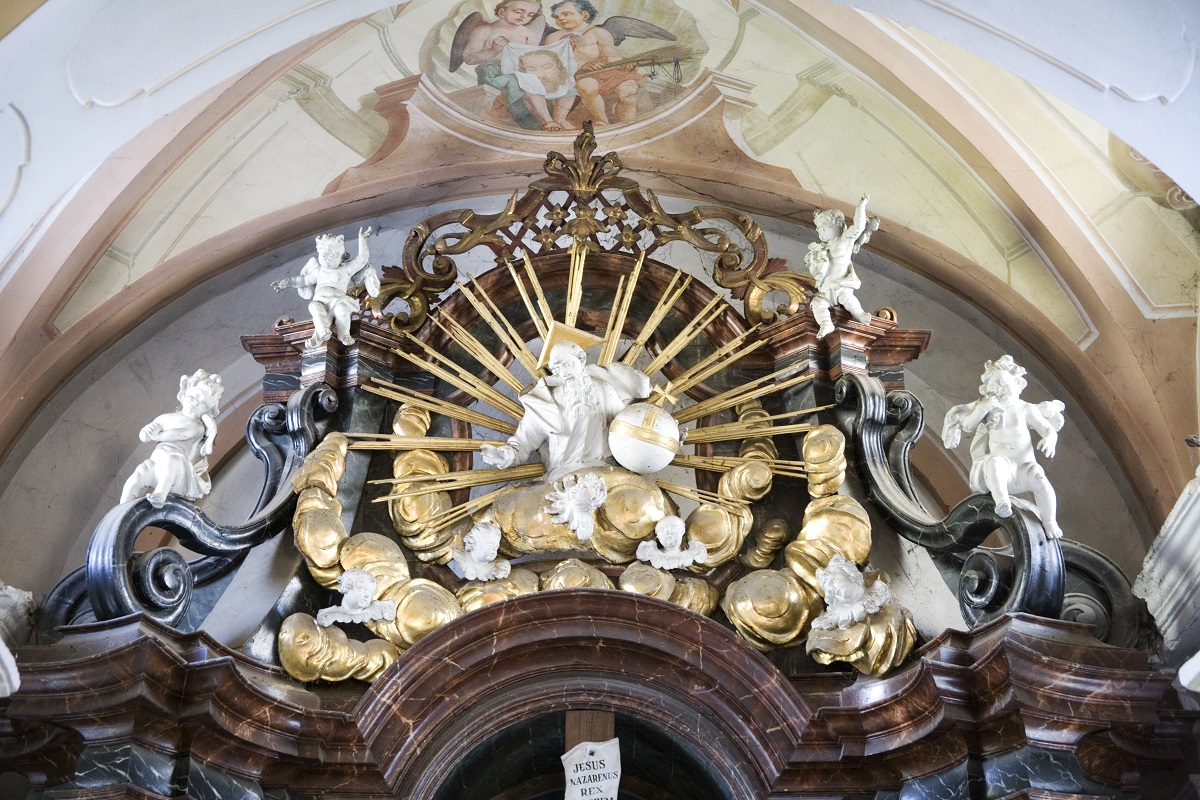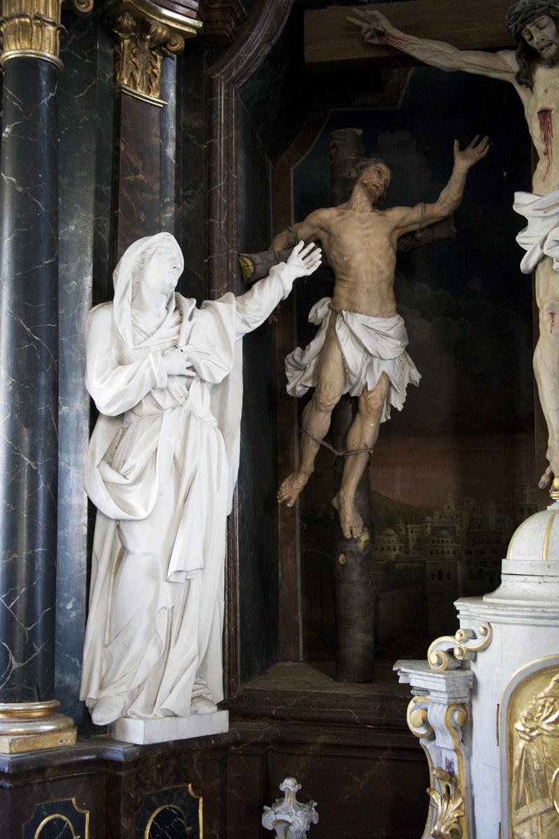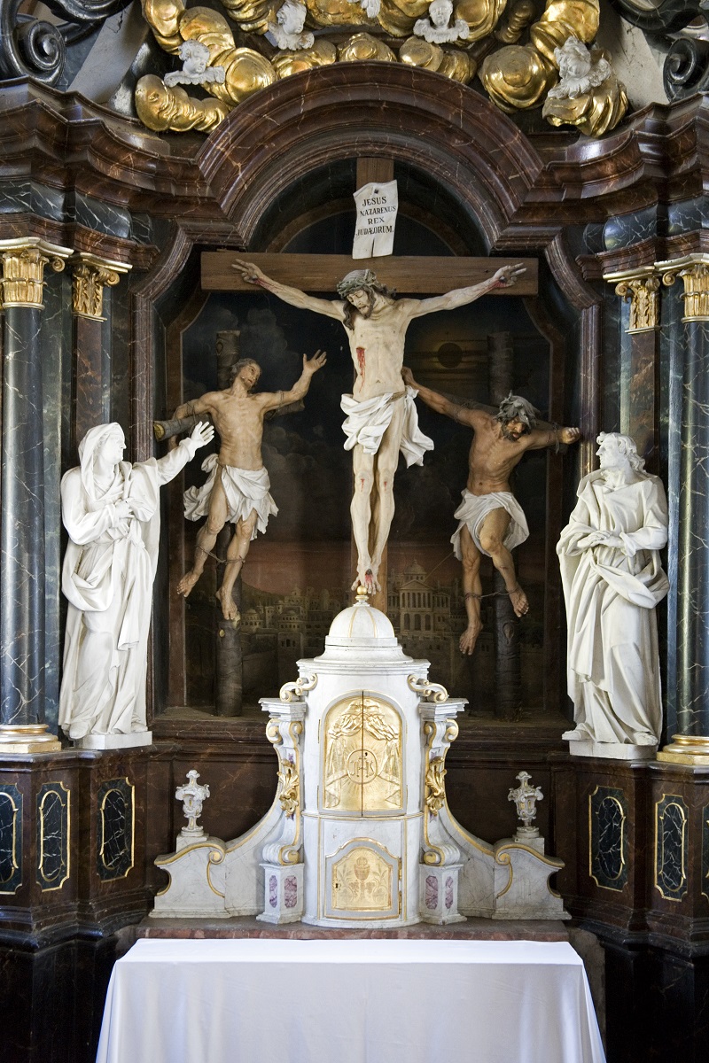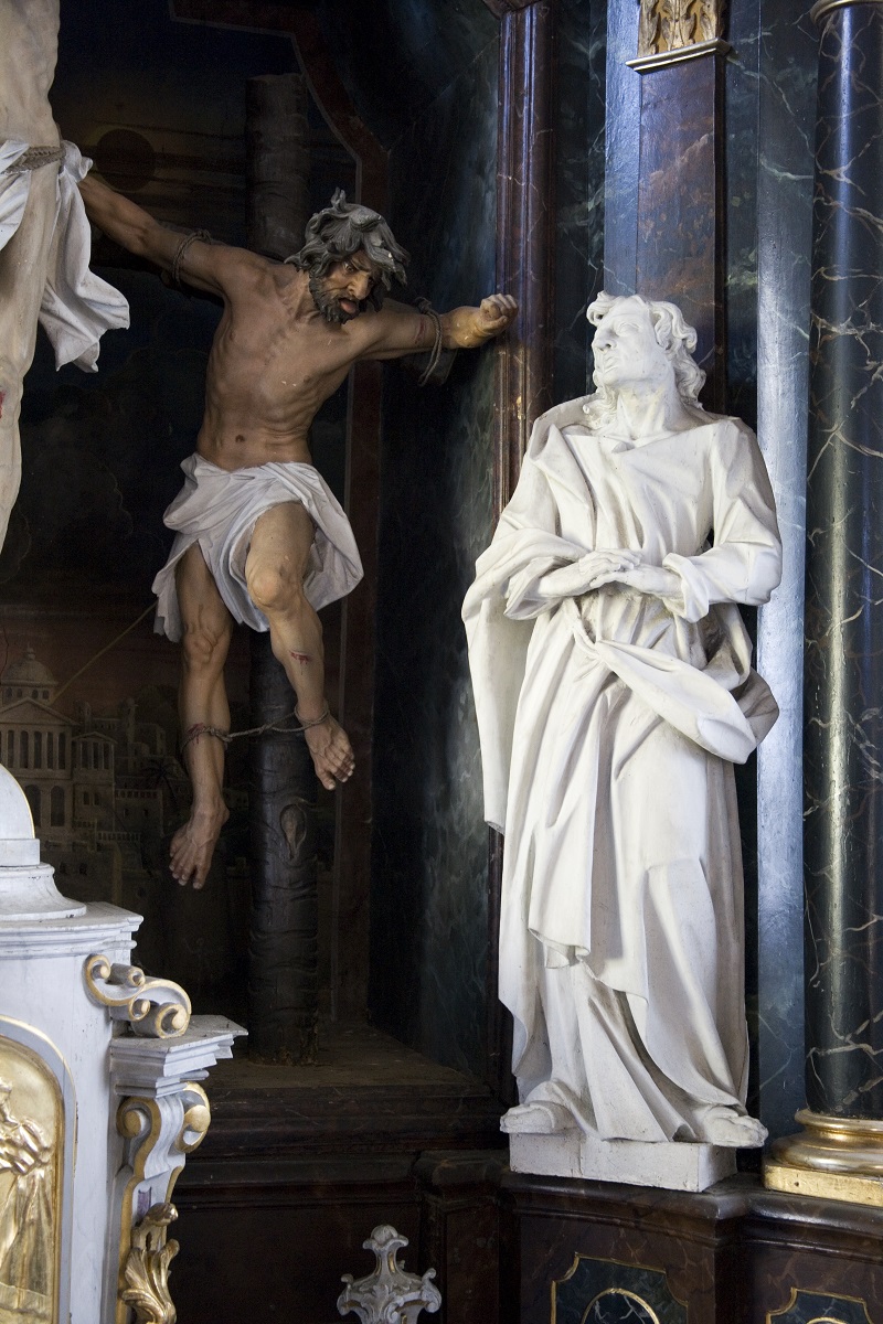 In the central niche of the altar, there is a sculpture of Christ on the cross between the two thieves. Behind them, there is a depiction of Jerusalem. On the sides, there is a sculpture of the Virgin Mary and a sculpture of St John the Evangelist. In the upper part of the altar, there is a sculpture of the Holy Father with the Globe surrounded with four sad and crying putti on the sides. All the sculptures are of high quality (especially the sculpture of Christ with many realistic details of veins and muscles) and they share similarities with other works by Philipp Jakob Straub. The face of St John the Evangelist, with a long nose and curly hair and the sculpture of the Holy Father, are especially significant. The expressive sculpture of the right thief is similar to the sculpture of a captor from the sculptural group of St John of Nepomuk in Graz (Calvary).