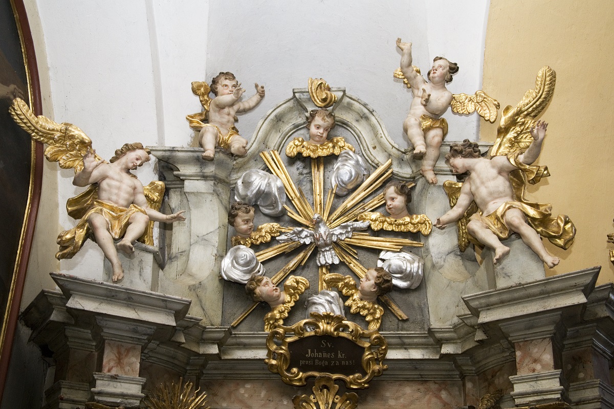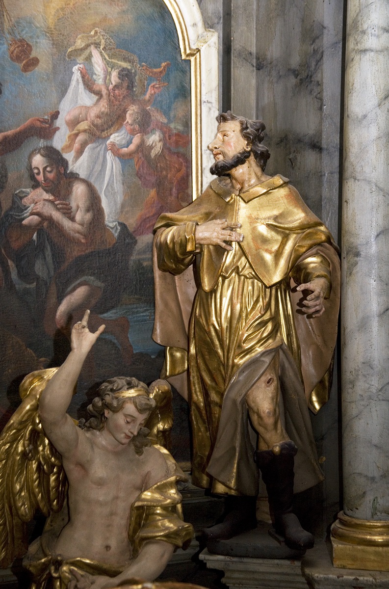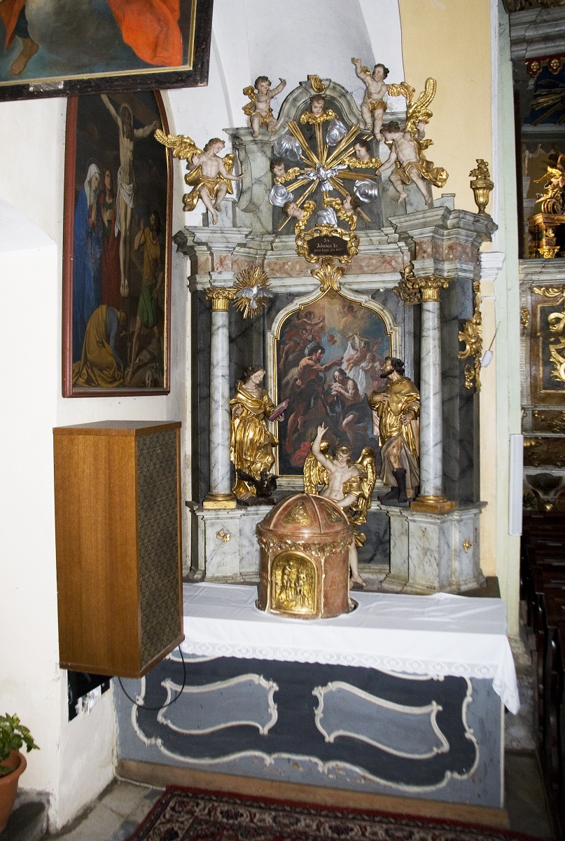 The side altar of St John the Baptist is placed in the second chapel on the left side of the church. The author of the painting with a depiction of the Baptism of Christ is unknown. On the left side of the painting, there is a sculpture of St John the Evangelist, and on the right of St Roch. In front of the altar, there is a sculpture of the Archangel Raphael with Tobias. The elegance of the sculpture of the Archangel Raphael is similar to the elegance of the sculpture of the Archangel Michael from the opposite altar. On the other hand, the faces of St Roch and St John the Evangelist show significant characteristics of Philipp Jakob Straub’s personal style: long bony noses, thin lips, significant finger joints, rich drapery.