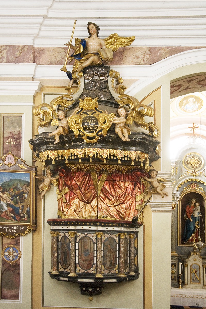 - The pulpit in the Parish Church of St George in Mozirje (Institute for the Protection of Cultural Heritage of Slovenia, photo by Valentin Benedik, 2018)