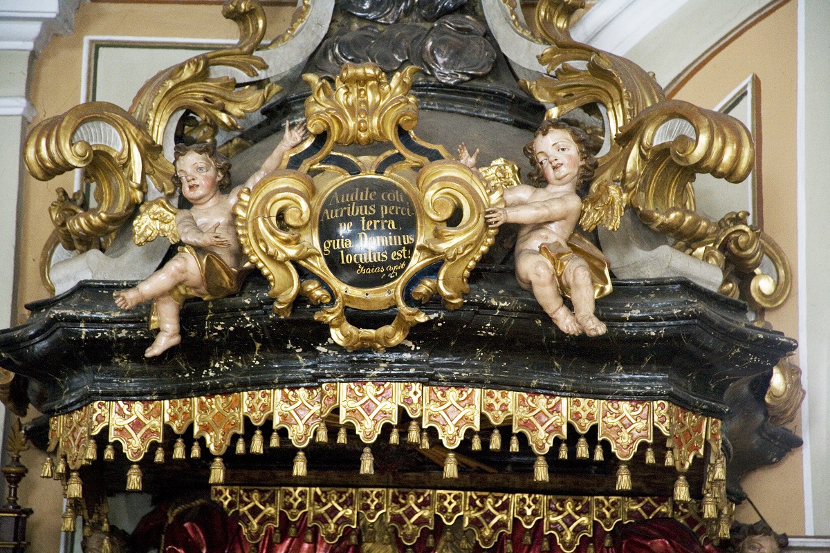 - The canopy of the pulpit in the Parish Church of St George in Mozirje (Institute for the Protection of Cultural Heritage of Slovenia, photo by Valentin Benedik, 2018)