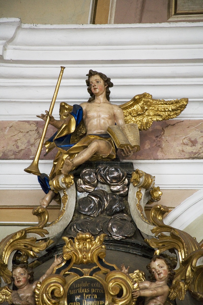 The architecture of the pulpit canopy is ornamented with two volutes, a cartouche, massive ornaments and flower garlands at the sides. At the top of the canopy, a sculpture of an angel with an open book and a trumpet. Two angels hold the cartouche and two flying angels hold the drapery under the roof.