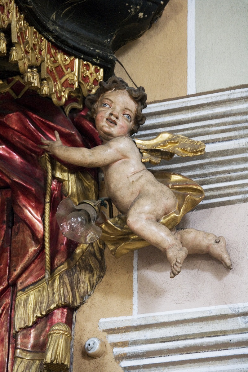 - The sculpture of a putto on the pulpit in Mozirje (Institute for the Protection of Cultural Heritage of Slovenia, photo by Valentin Benedik, 2018)